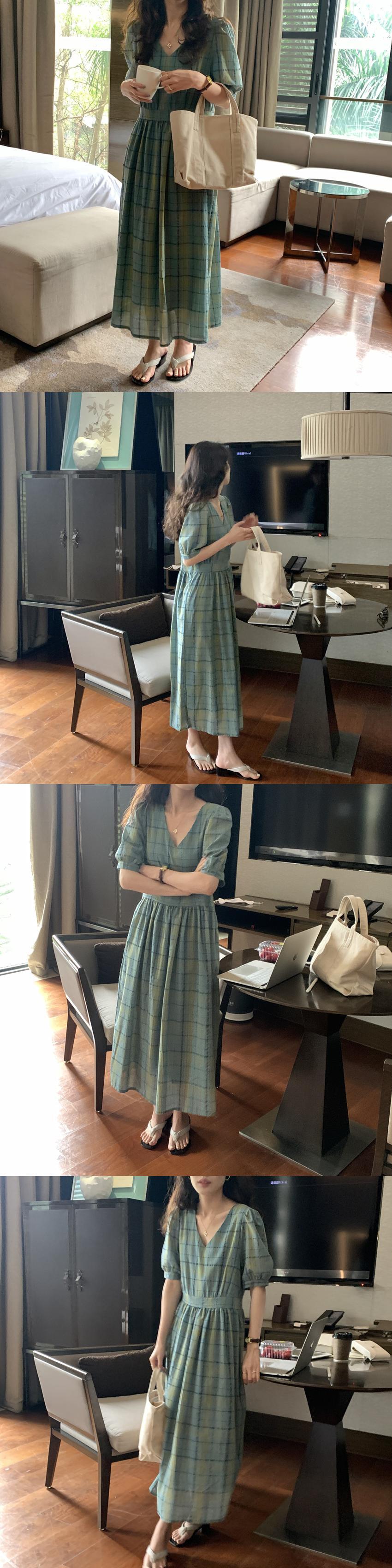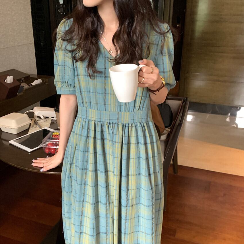 韓国ファッションNEW夏服Vネックスリーブ格子柄ロングウェストスリムミニ ワンピースワンピースレディース 夏物 ウエスト muzly94325716911