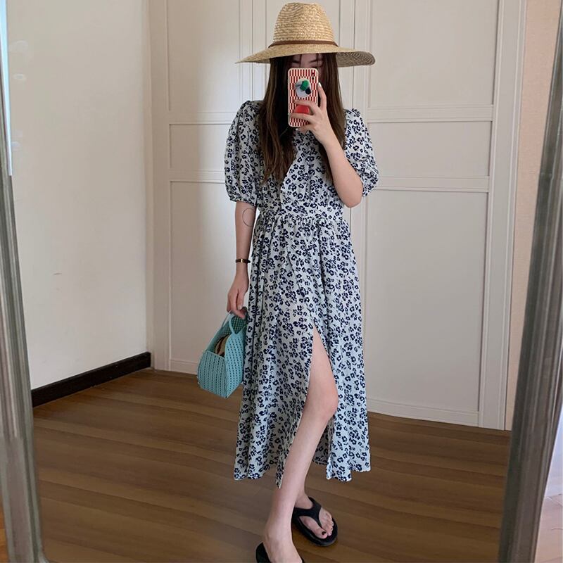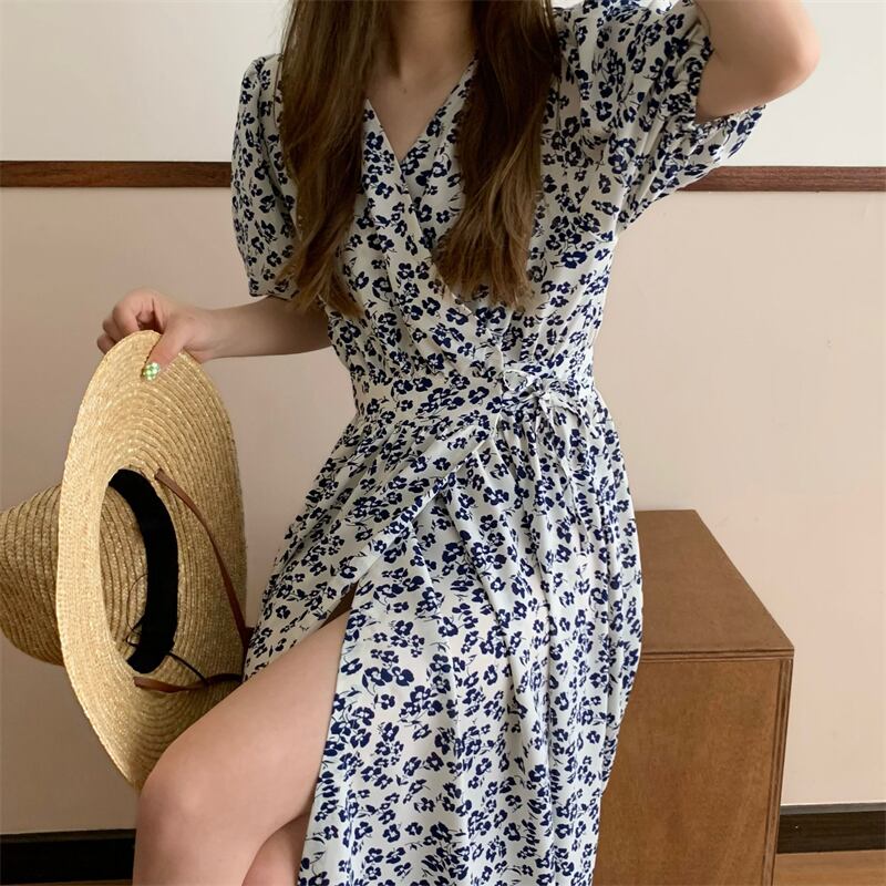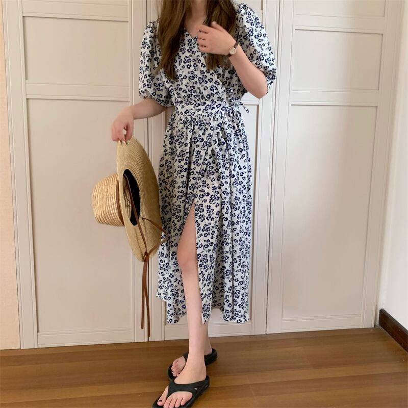 NEW夏服スタンダードVネックワンピースフローラルロングスカート ウェストミニ ワンピースレディース レトロ レース 夏物 花柄 レースアップ ウエスト muzly27421382168 | Neatly