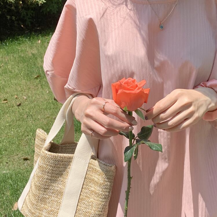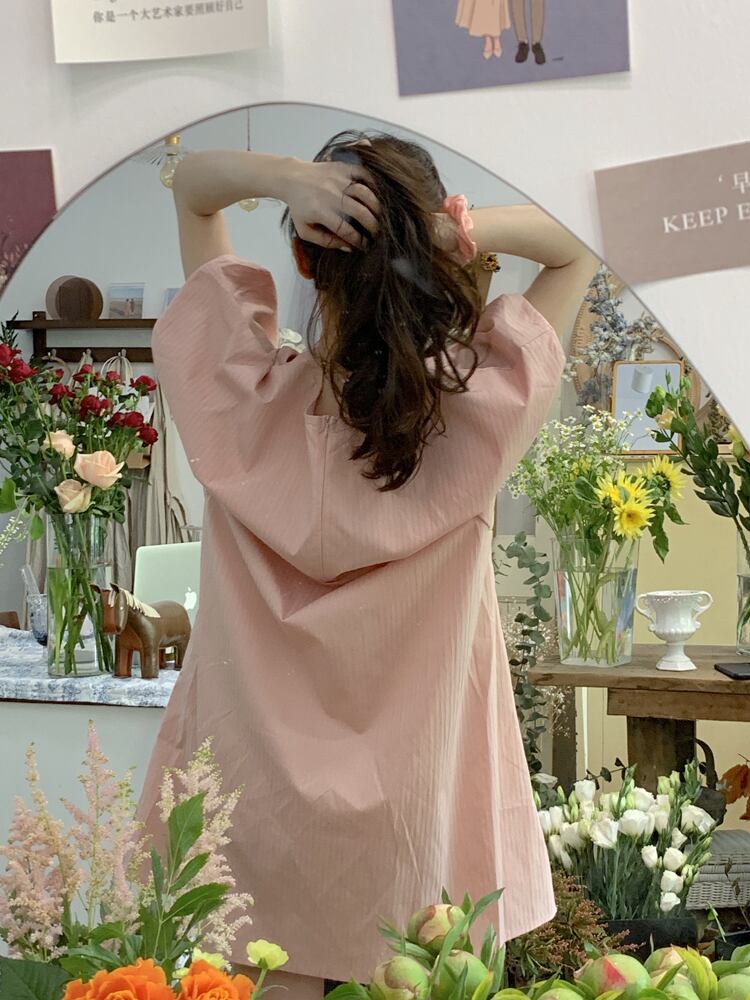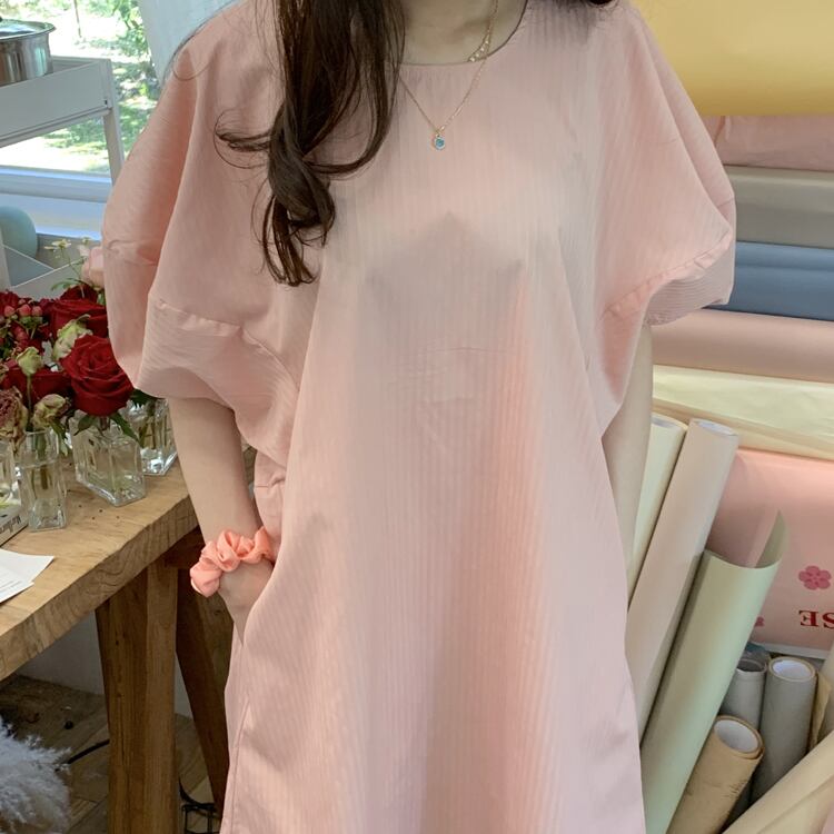 韓国ファッションスタイルパウダールーズスリーブショートスカート ダークストライプ半袖ワンピース ランタンスリーブ ハーフスリーブ 大人ガーリー スウィート キュート カジュアル muzly58773852304 | Neatly