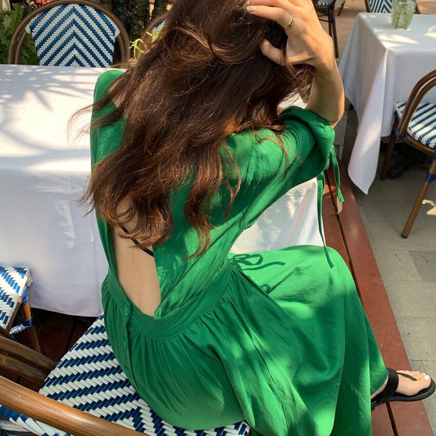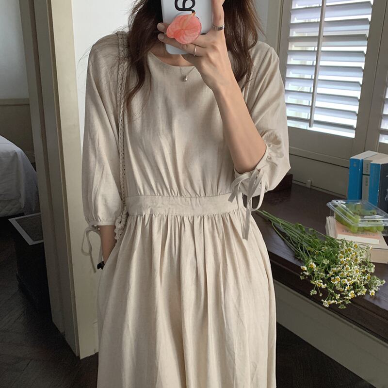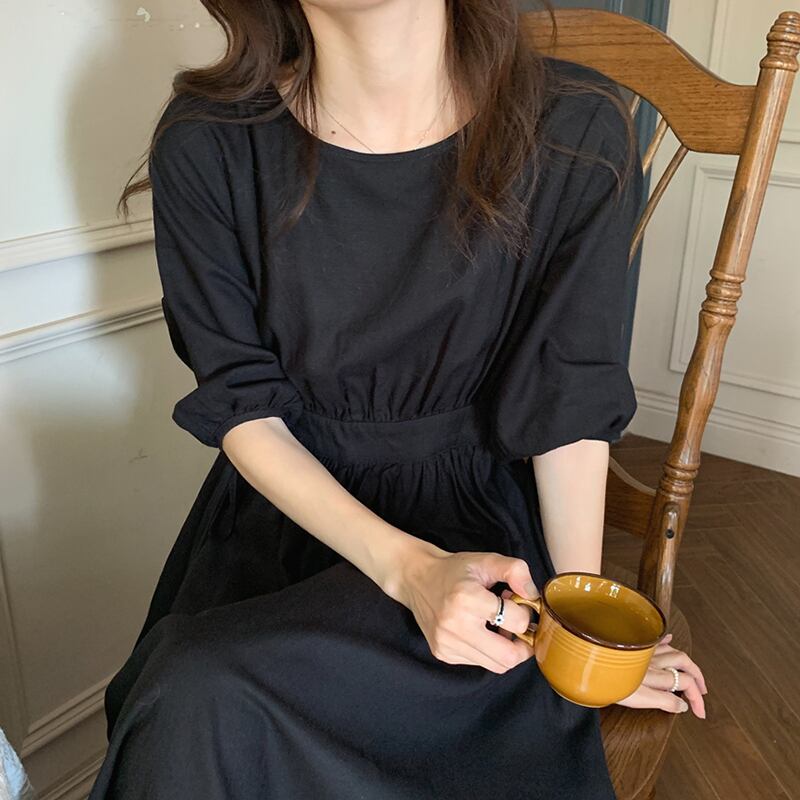 韓国ファッション夏服スタンダードバックハイウェストウェスト半袖スリーブワンピースレディース ショート レトロ ハーフスリーブ 夏物 ウエスト muzly8783578820