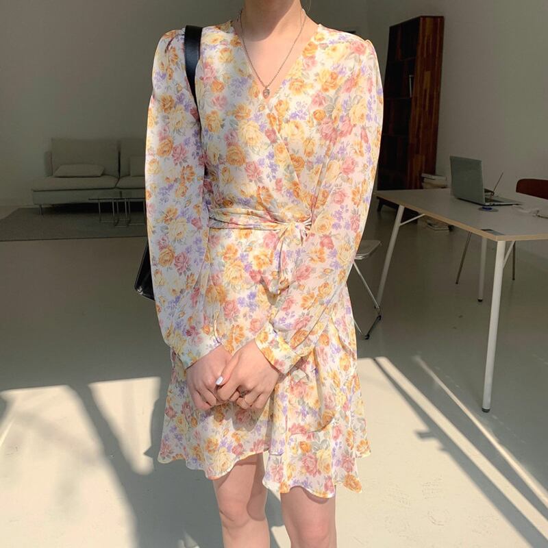 NEW夏服Vネックスリーブフローラルスカート ウェストワンピースレディース ロング レース 大人ガーリー スウィート キュート カジュアル 夏物 花柄 レースアップ 長袖 ウエスト muzly30104587445 | Neatly