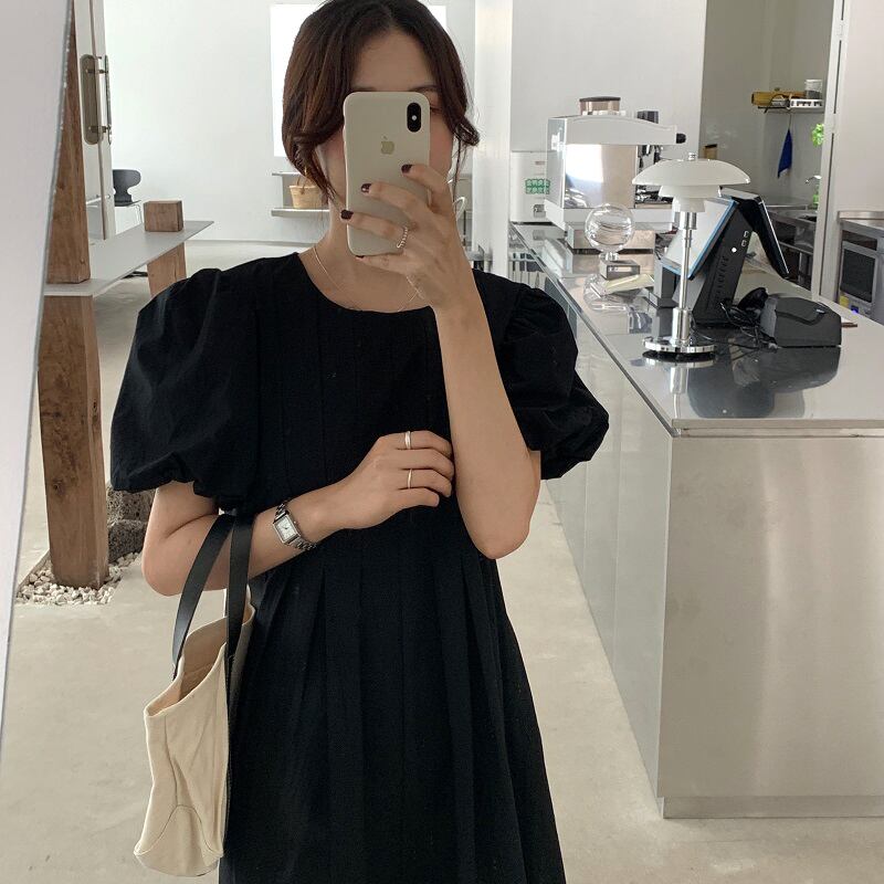 スプリングスタンダードラウンドネックスリーブロングプリーツウェストスリムミニ ワンピースワンピース レトロ 春物 Oネック ウエスト muzly74840038482