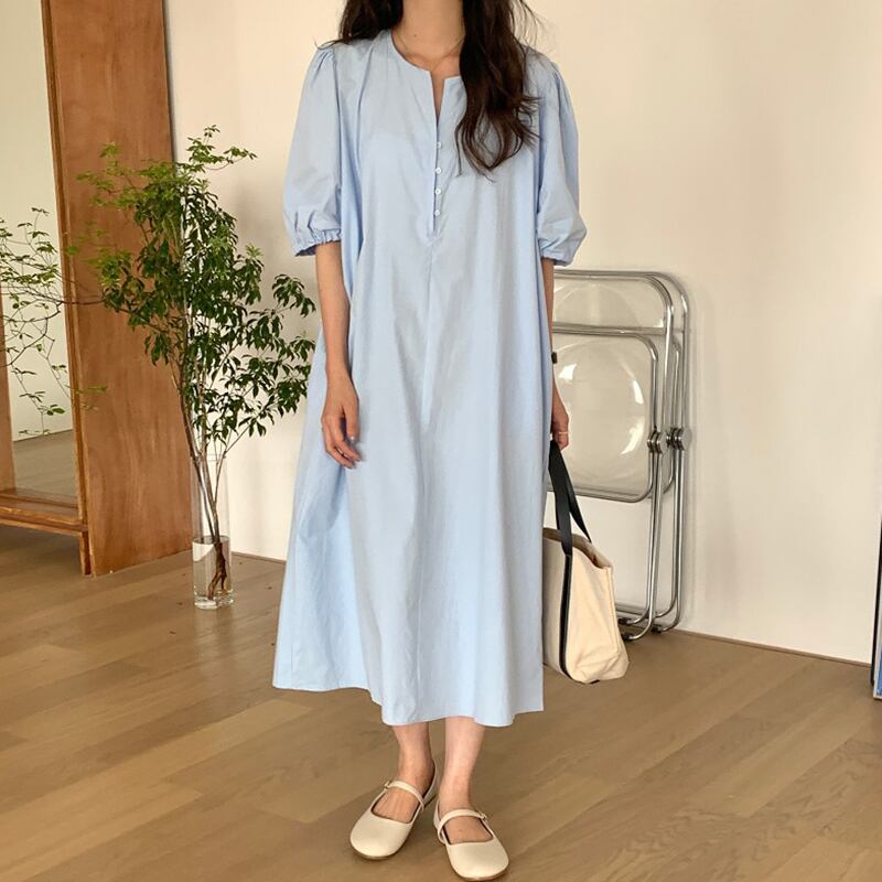 韓国ファッション夏服ソリッド カラーVネックスリーブワンピース 夏物 ソリッドカラー ミドル丈 muzly45991002938