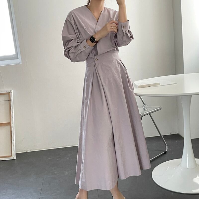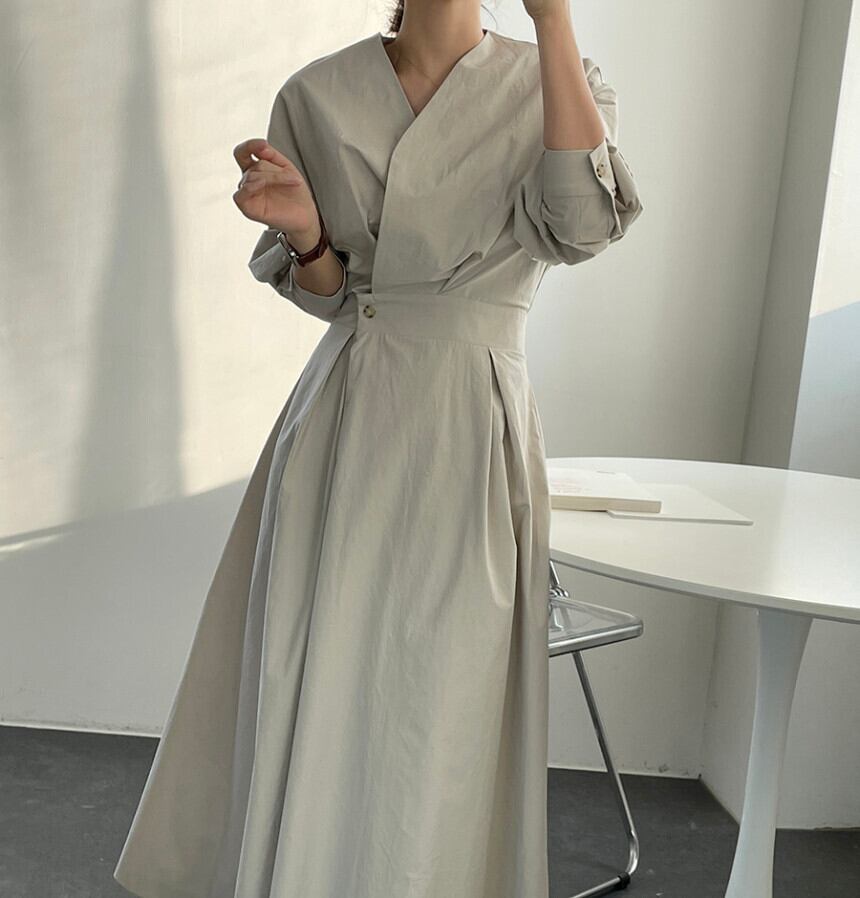 韓国ファッションNEWスタンダードクロスVネックハイウェストウェストロングスカート 秋物ソリッド カラーワンピース レトロ オータム ソリッドカラー 長袖 ウエスト muzly22765189809 | Neatly