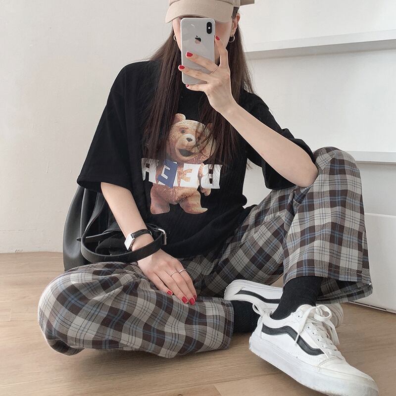 夏服プリント柄ルーズTシャツストレッチハイウェスト格子柄カジュアルパンツ レディース エラスティック 伸縮 大人ガーリー スウィート キュート 夏物 ウエスト muzly90829965966 | Neatly