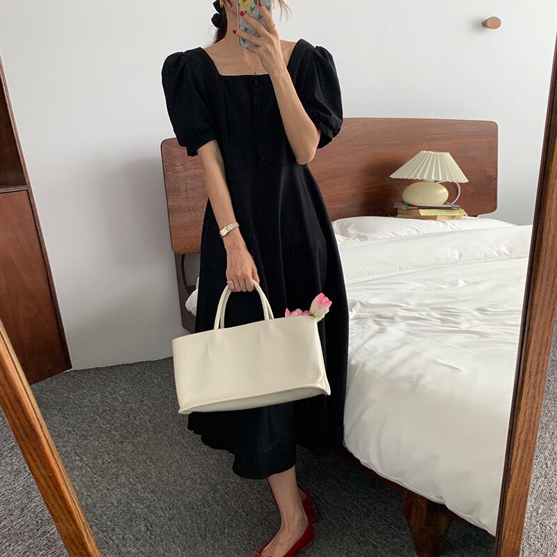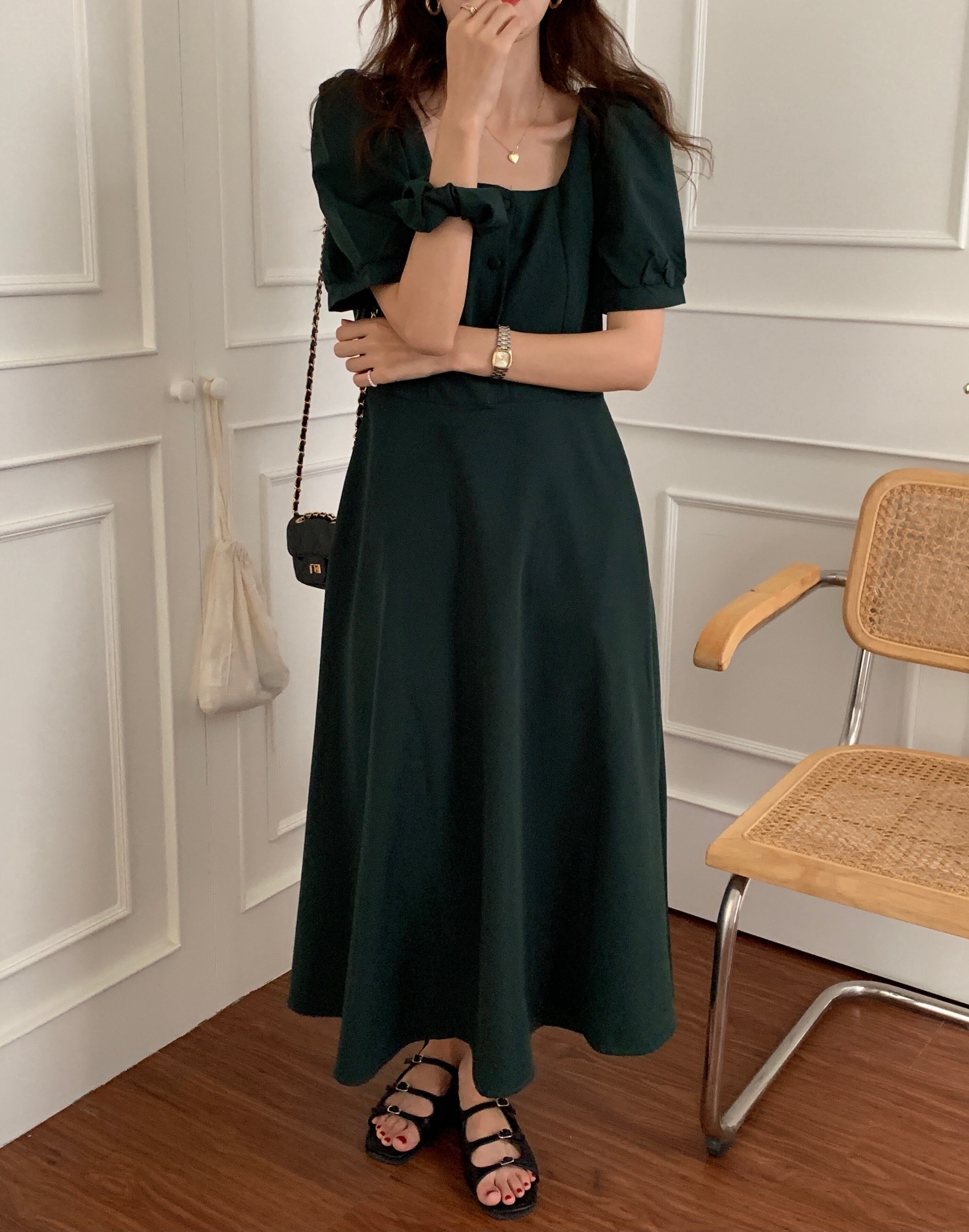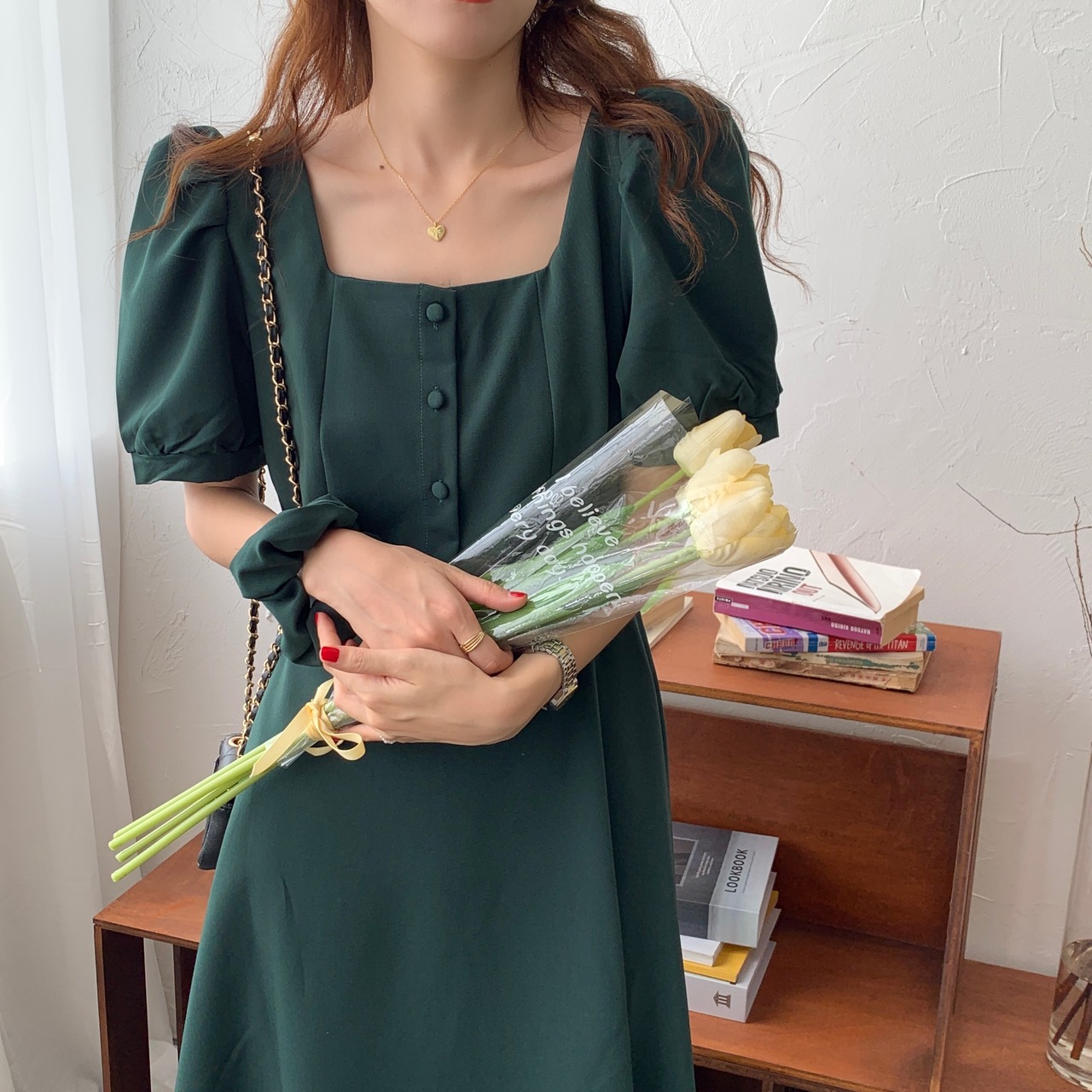 スタンダードカラーパフスリーブスリーブロングスカート 夏服ハイウェストウェストスリム半袖ワンピース ショート レトロ ハーフスリーブ 夏物 スクウェア ウエスト muzly85092751723 | Neatly