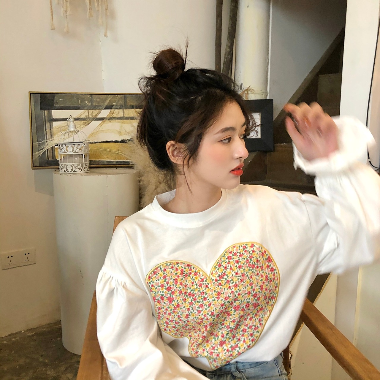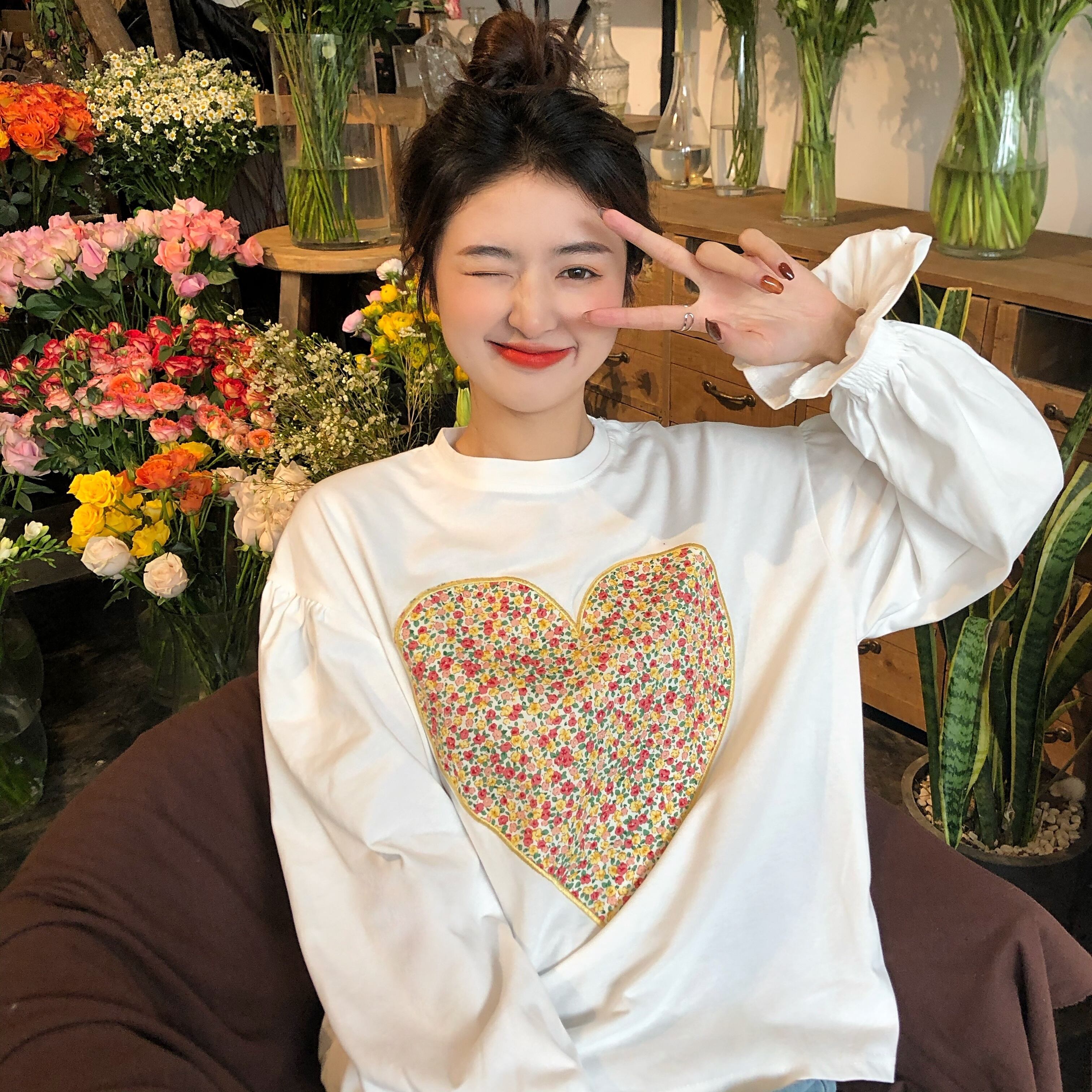 スプリングスタンダードフローラルトップス 韓国ファッションルーズTシャツレディース ロング レトロ 大人ガーリー スウィート キュート カジュアル 春物 花柄 ステッチ 長袖 muzly96658893752
