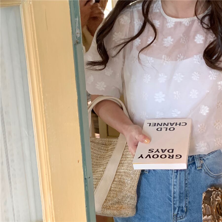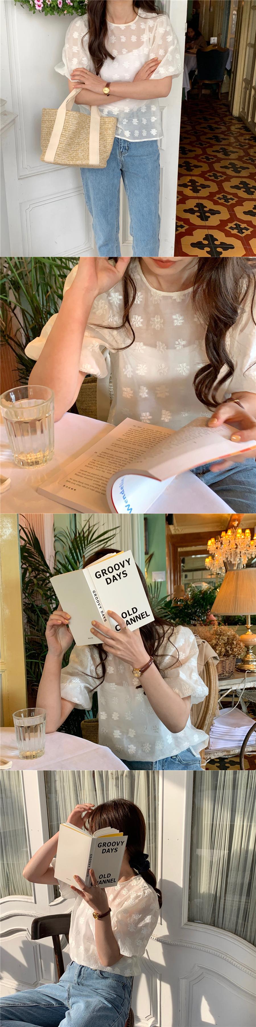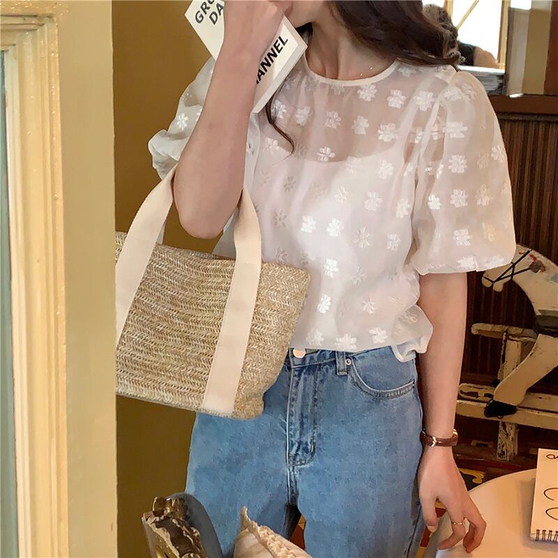 夏服ラウンドネックパフスリーブスリーブFlowerデザイン 薄手シャツ ジャケット レディース 夏物 Oネック フラワーデザイン muzly90520165667