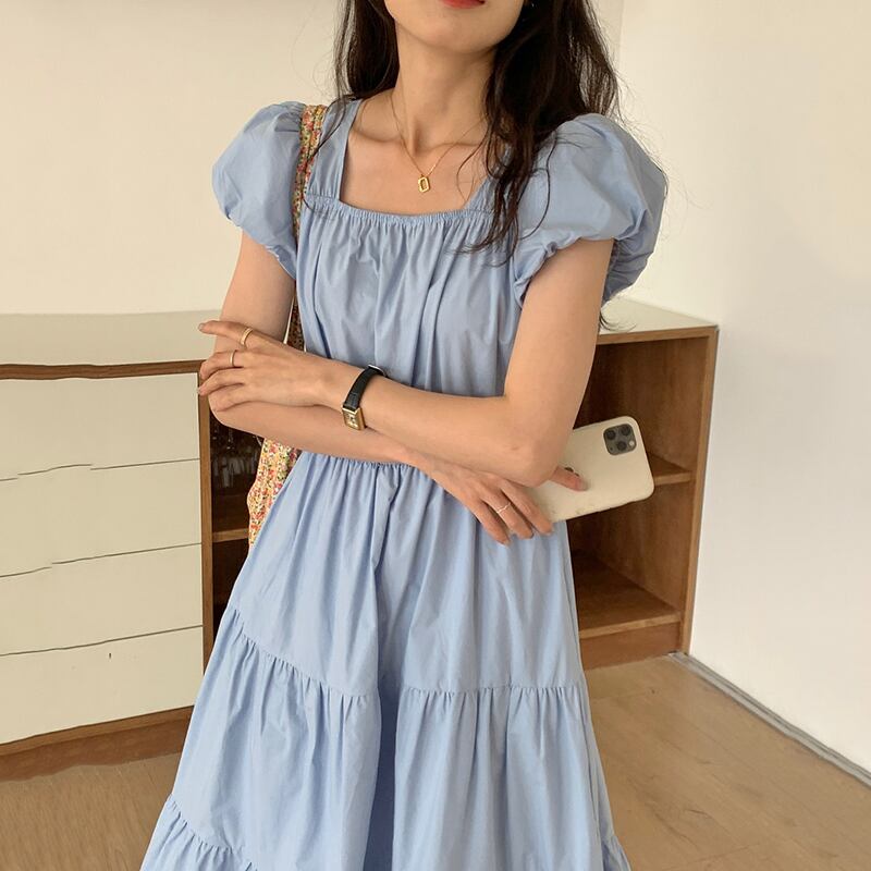 韓国ファッション夏服スリーブワンピースロングウェスト薄手ミニ ワンピースレディース 夏物 スクウェア ウエスト muzly16079433371
