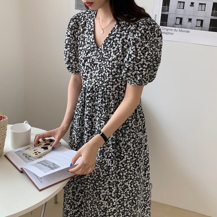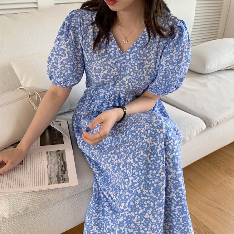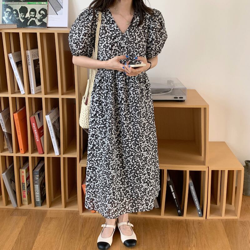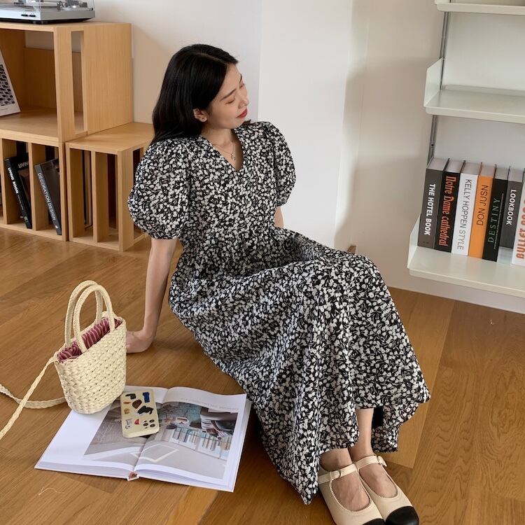 NEW夏服スタンダードVネックスリーブフローラルロングスカート ルーズハイウェストウェストミニ ワンピースワンピースレディース レトロ 夏物 花柄 ウエスト muzly55487995896 | Neatly