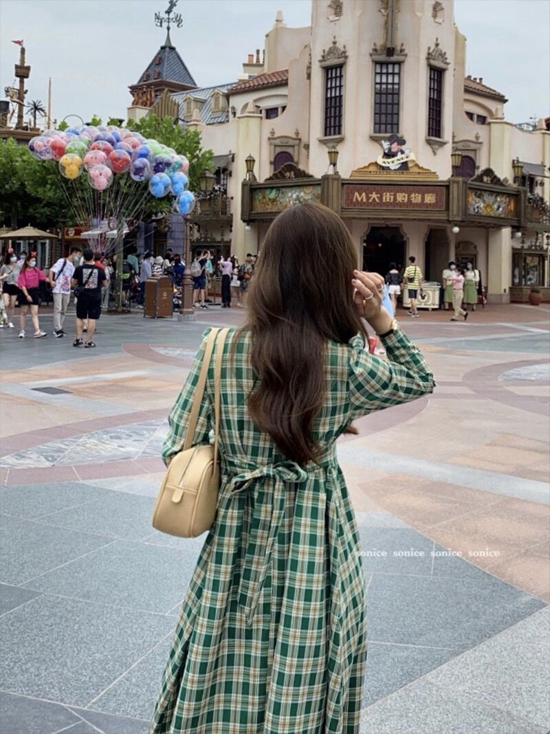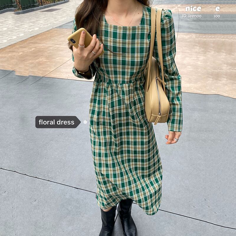 スプリングスタイルパターンスリーブウェストワンピース ロング レース 春物 レースアップ スクウェア 長袖 ウエスト ミドル丈 muzly77508712411