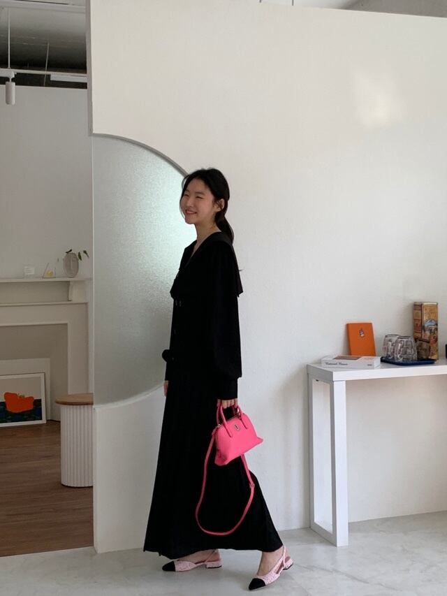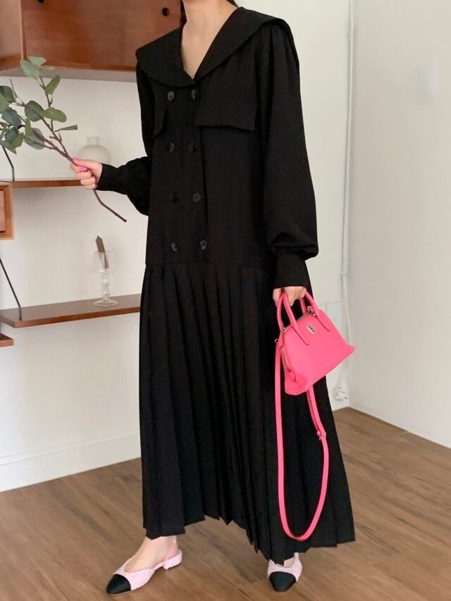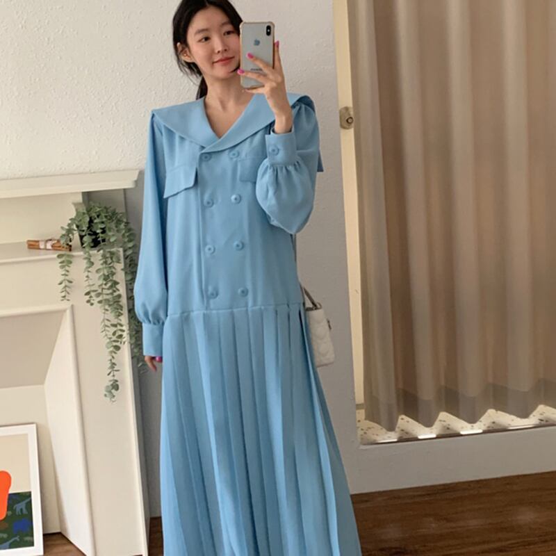 韓国ファッションスプリングスタンダードダブルブレストルーズロングプリーツスカート ワンピース レトロ 春物 長袖 muzly44157301772