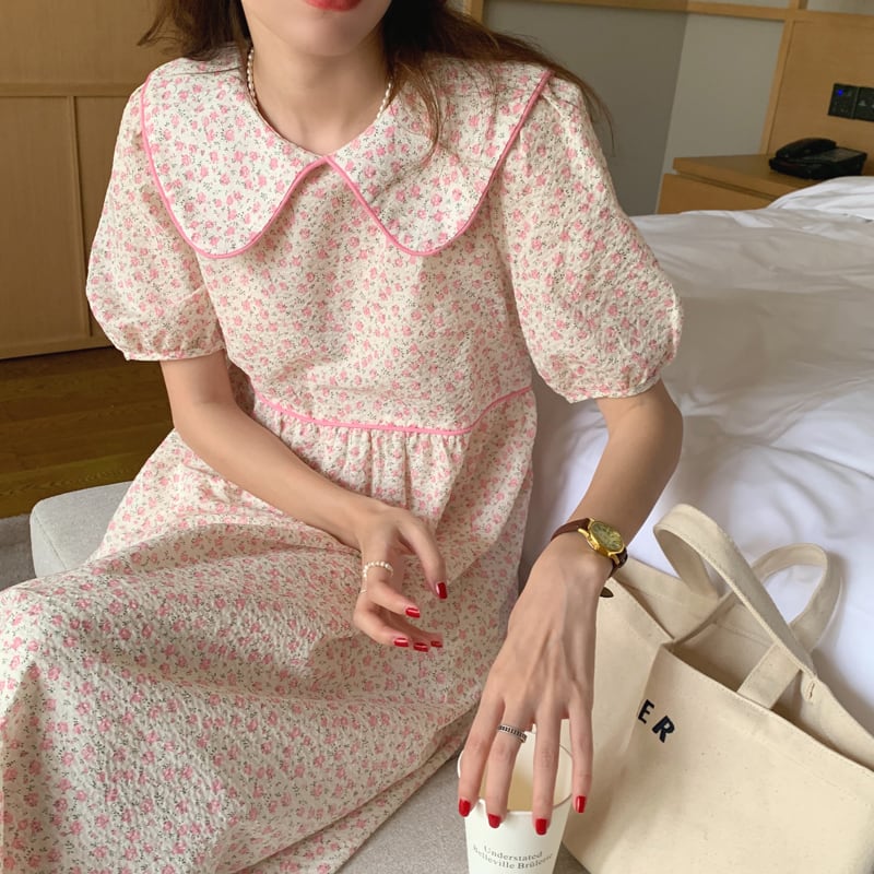 韓国ファッション夏服スタンダードカラースリーブフローラルミニ ワンピースワンピース レトロ 大人ガーリー スウィート キュート カジュアル 夏物 花柄 ミドル丈 muzly74278392203
