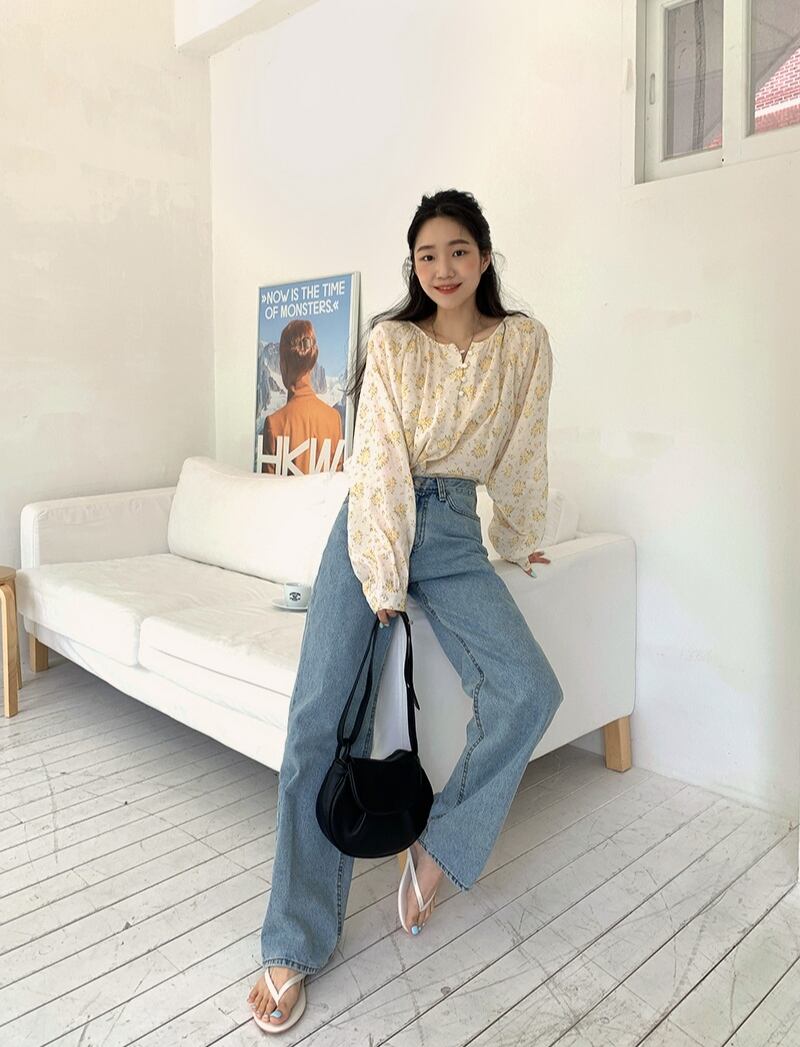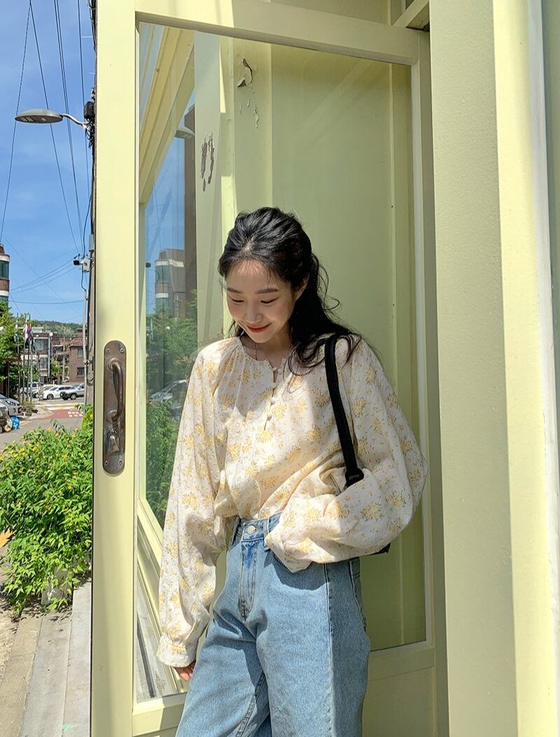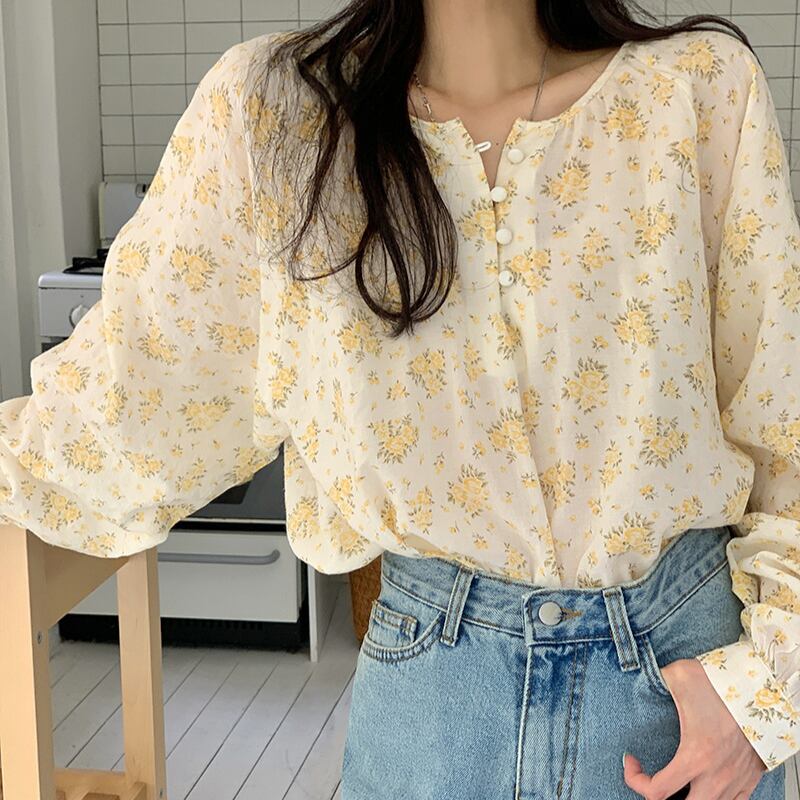 韓国ファッション夏服フローラルブラウス ラウンドネックルーズ薄手シャツ レディース ロング 大人ガーリー スウィート キュート カジュアル 夏物 花柄 Oネック 長袖 muzly51235562663
