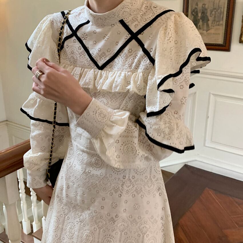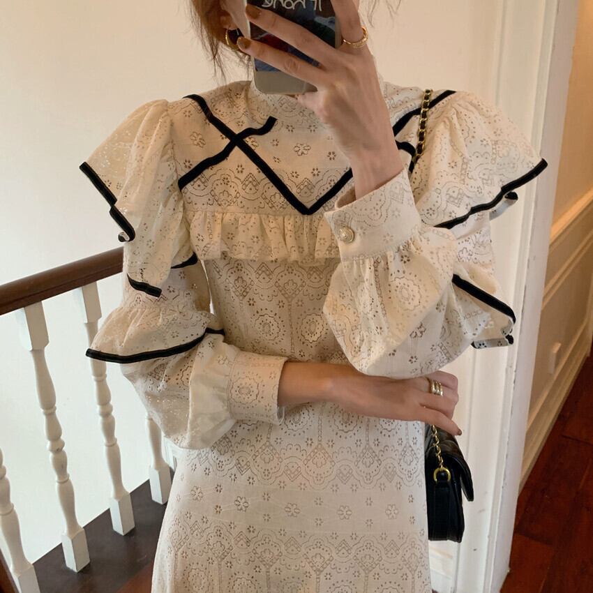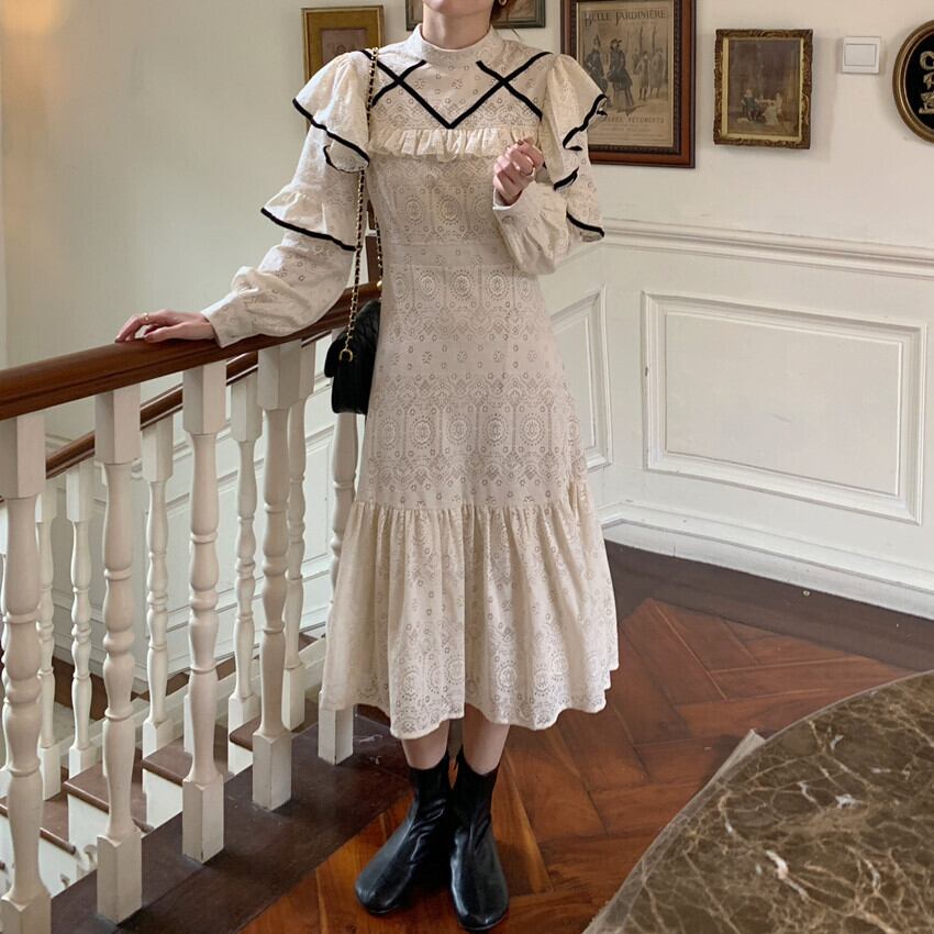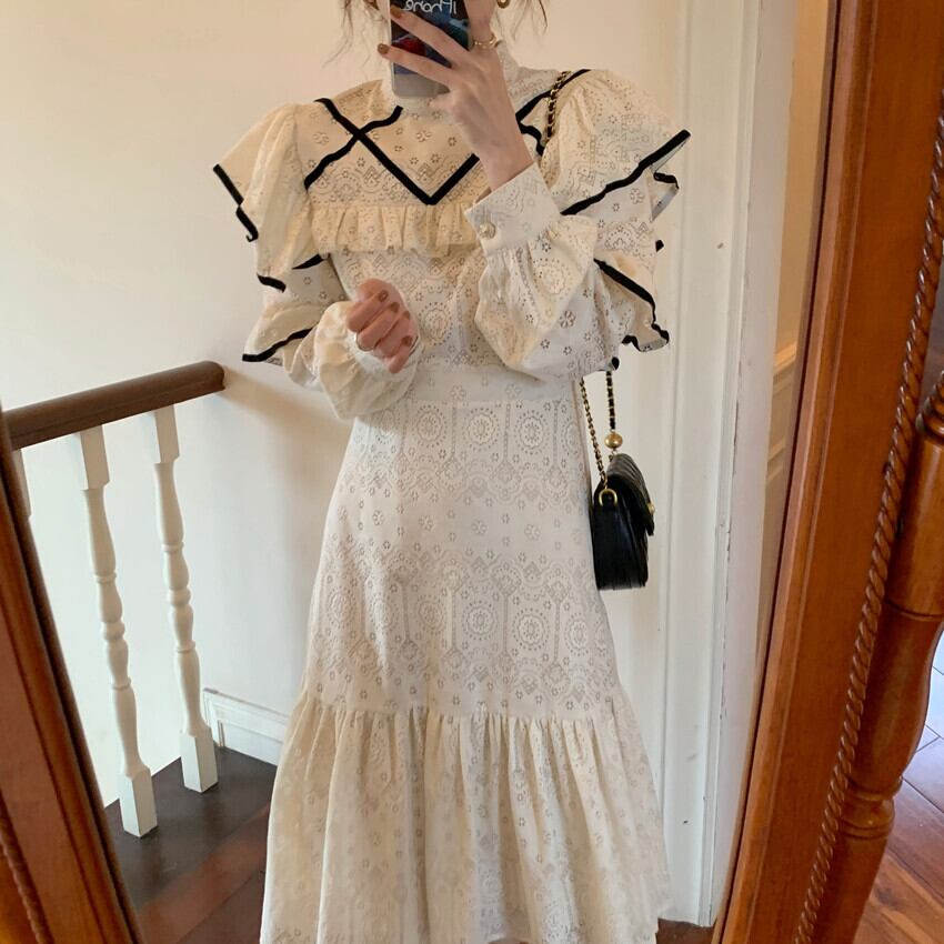 韓国ファッションスタンダードレーススタイルカラーロングスカート ワンピースレディース レトロ 長袖 muzly45584481078