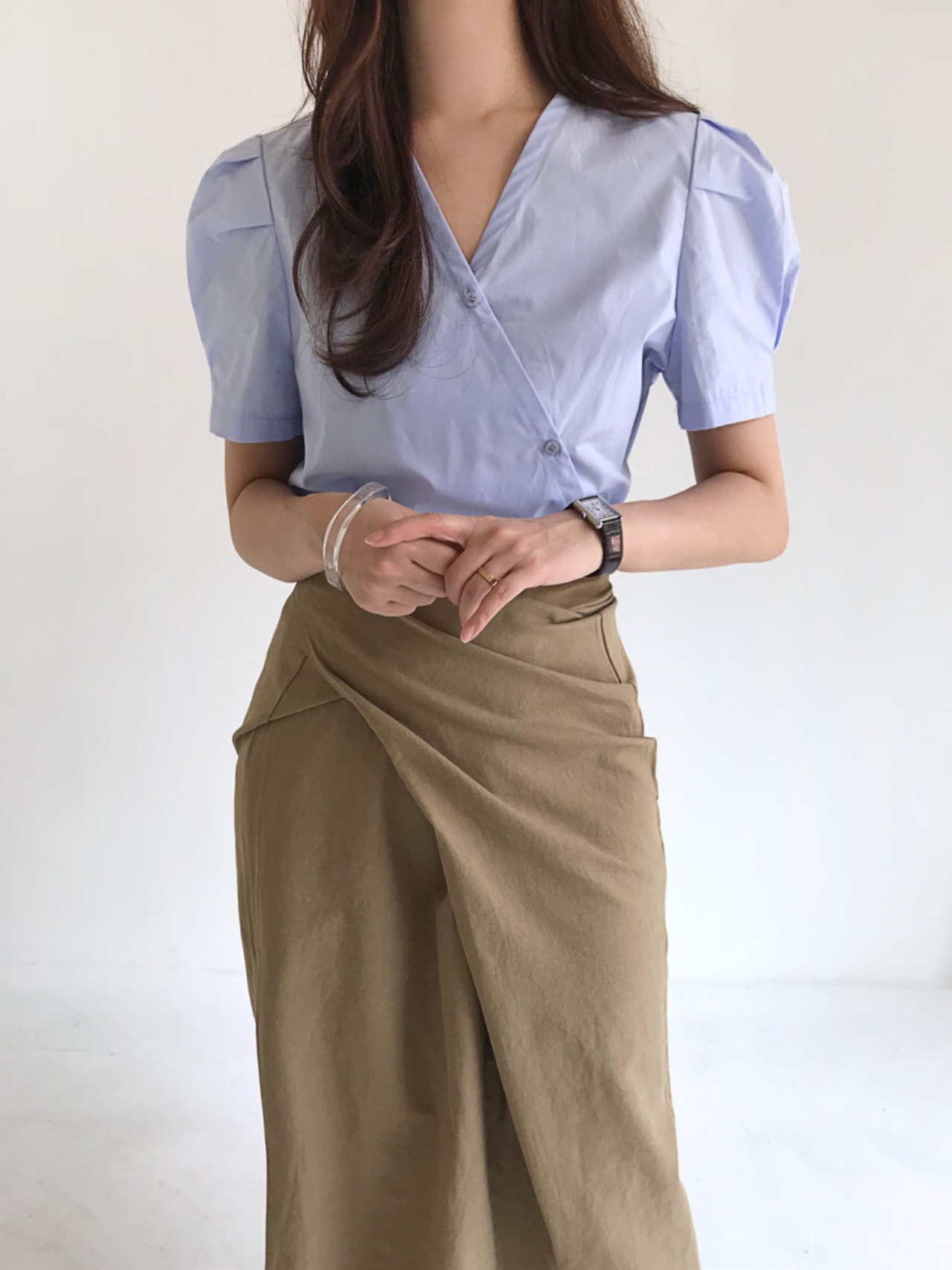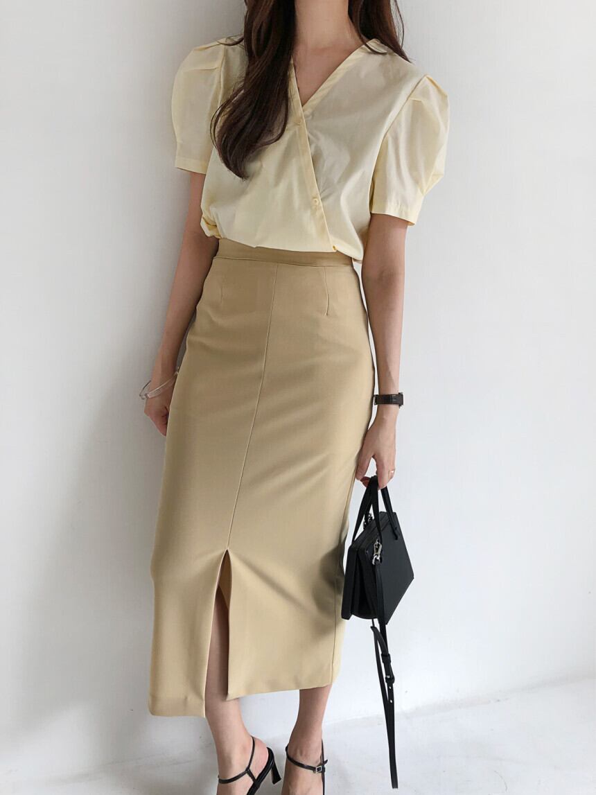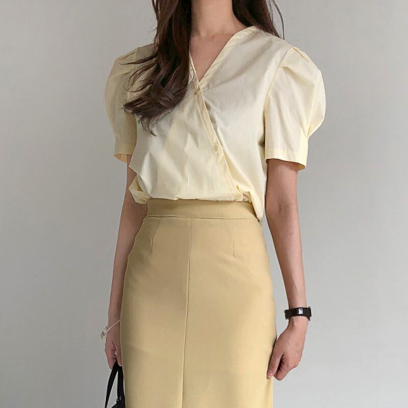 韓国ファッションNEW夏服Vネックボタンパフスリーブスリーブソリッド カラーカジュアルシャツ トップス レディース 夏物 ソリッドカラー muzly54751195790