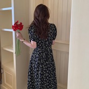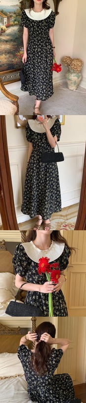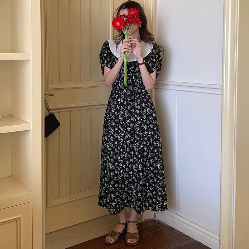 韓国ファッション夏服プリーツカラースリーブロングスカート ハイウェストウェスト半袖フローラルワンピース ショート ハーフスリーブ 夏物 花柄 ウエスト muzly34855961115
