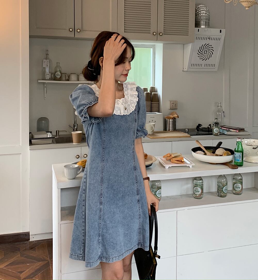 夏服カラーレースラウンドネックスリーブバックレスワンピースレディース 夏物 Oネック muzly88257350948