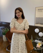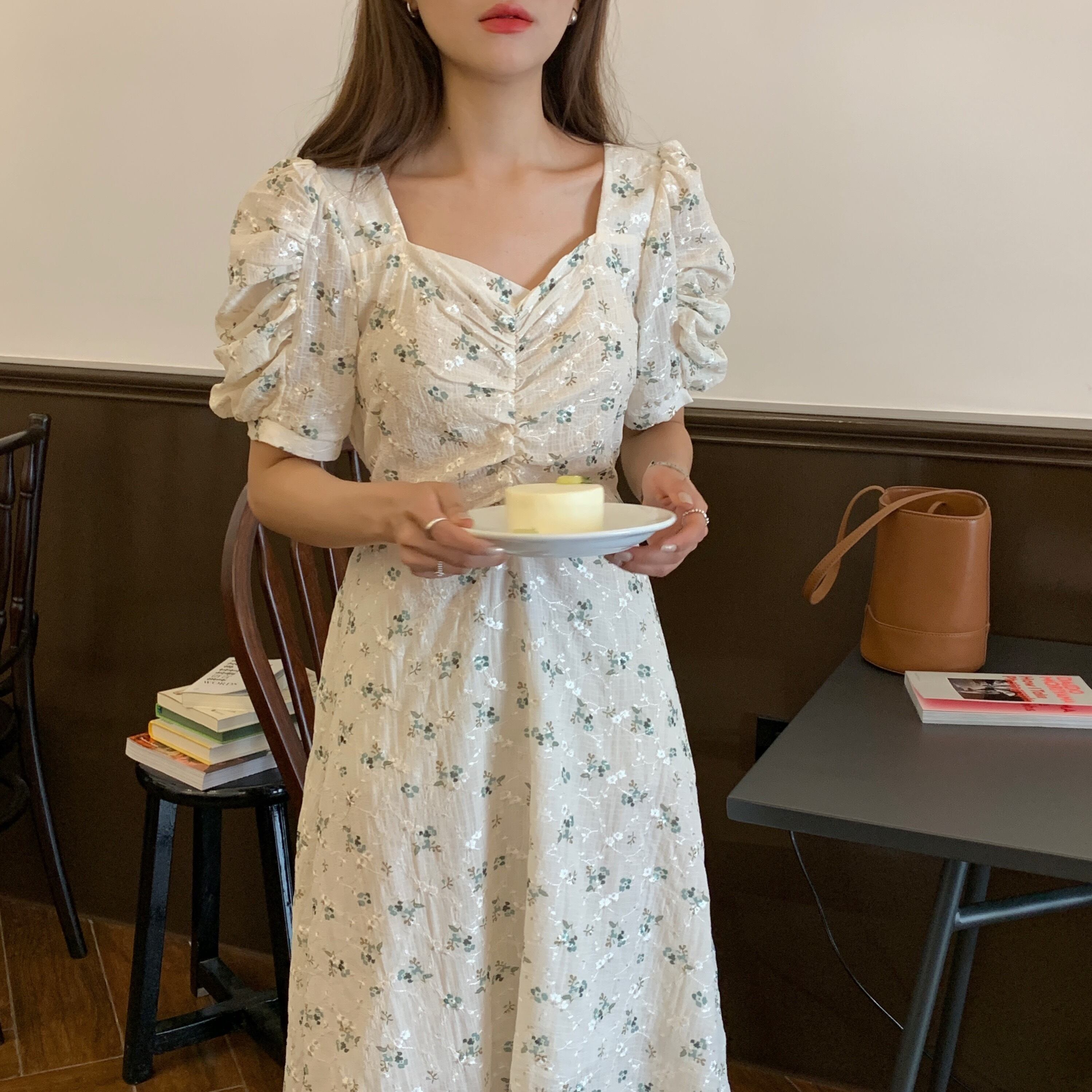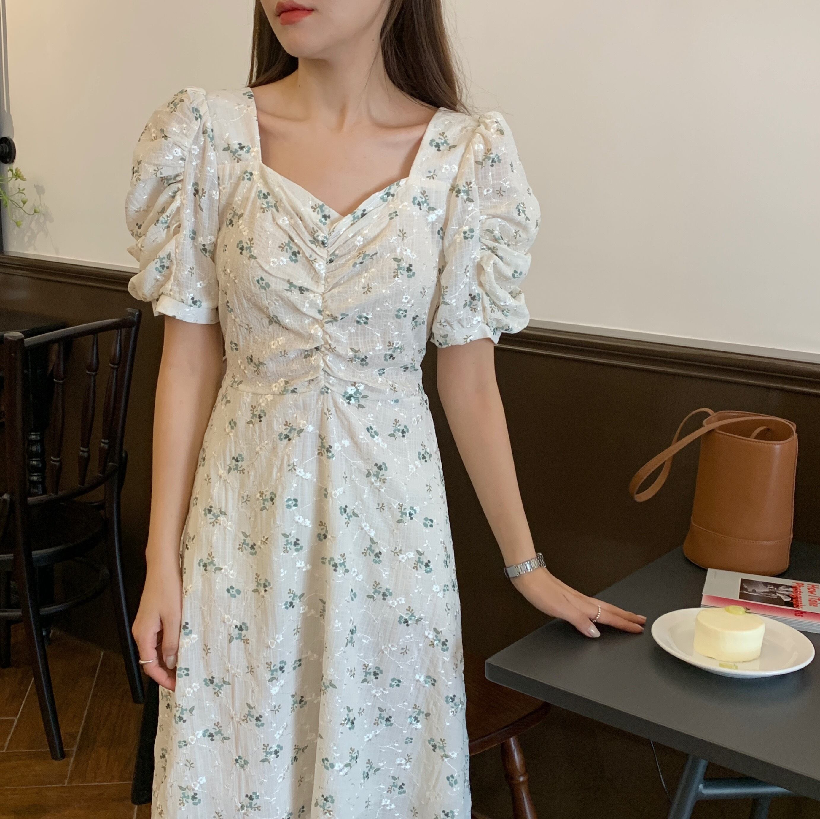 韓国ファッション夏服プリーツVネックスリーブフローラルロングスカート ウェストスリムミニ ワンピースワンピース 夏物 花柄 ウエスト muzly52383181795