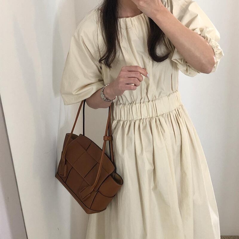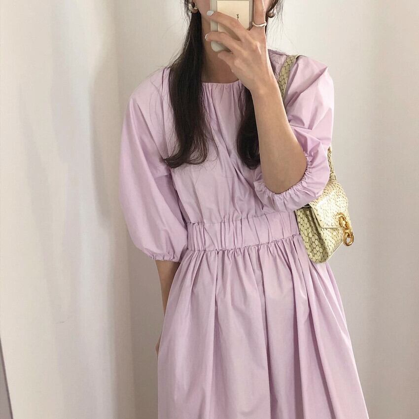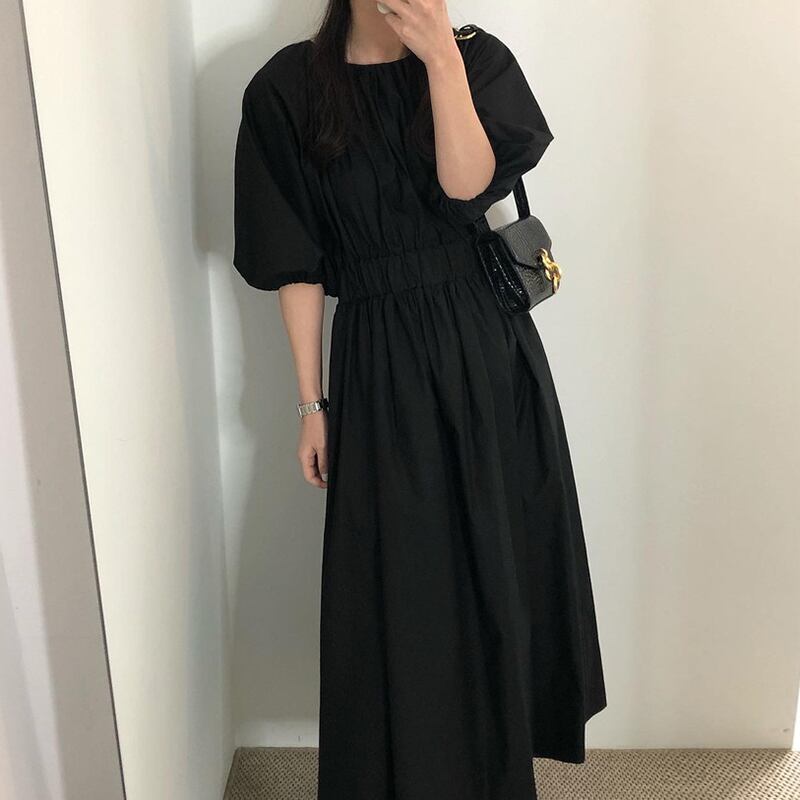 韓国ファッション夏服スタンダードソリッド カラースリーブラウンドネックウェストロングルーズ半袖ワンピース ショート レトロ ハーフスリーブ 夏物 Oネック ソリッドカラー ウエスト muzly60901589023 | Neatly