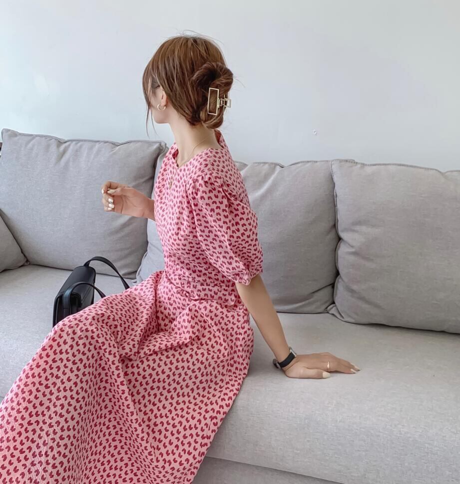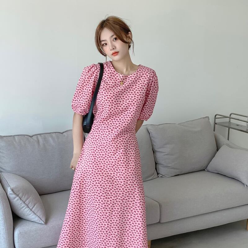 韓国ファッション夏服ラウンドネックプリント柄ロングスカート ウェスト半袖スリーブワンピースレディース ショート ハーフスリーブ 大人ガーリー スウィート キュート カジュアル 夏物 Oネック ウエスト muzly96763031186 | Neatly