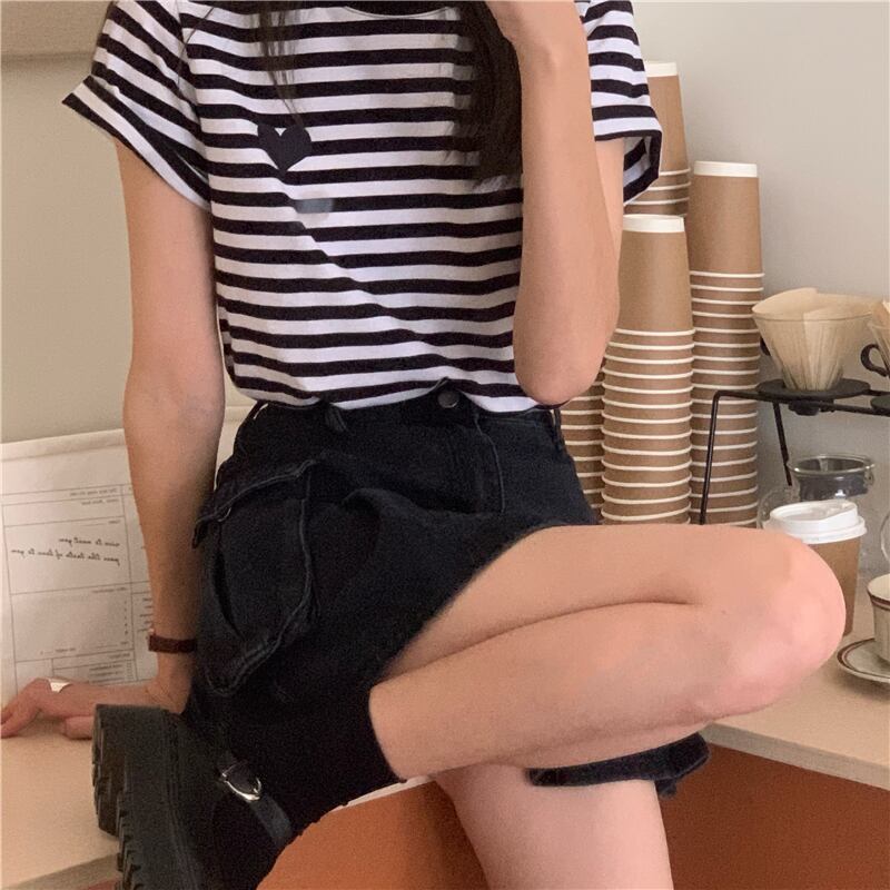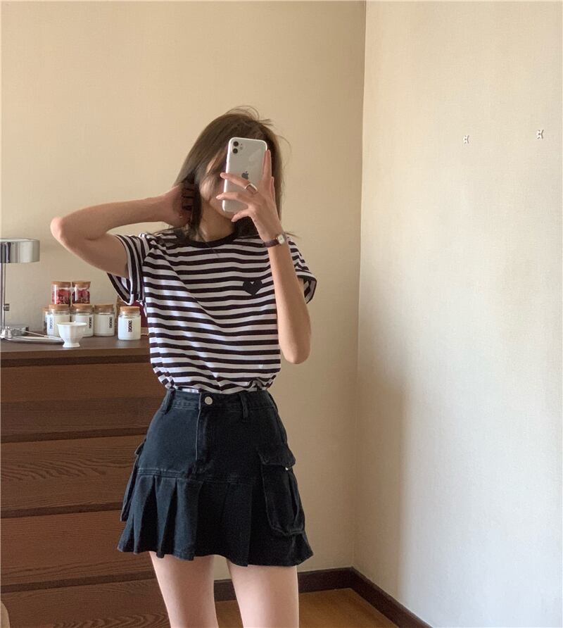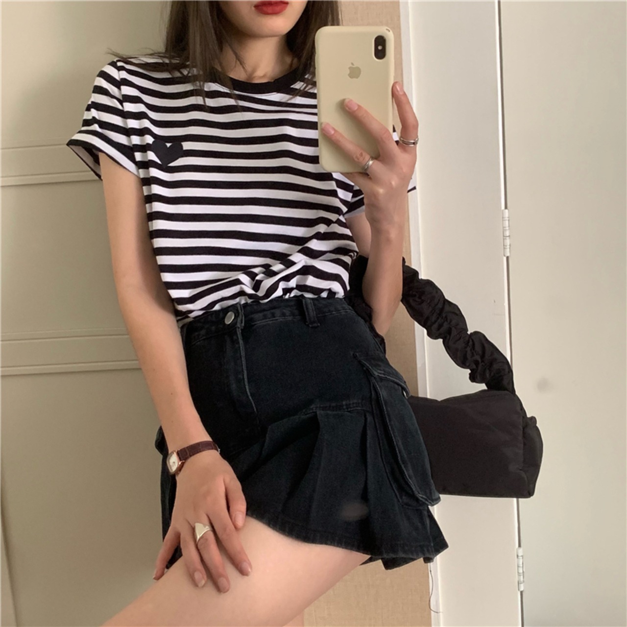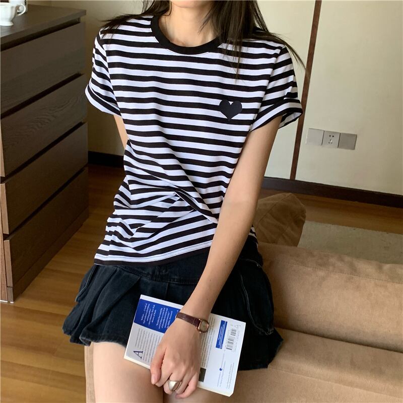 夏服ベーシックラウンドネック刺繍ストライプルーズカジュアルTシャツトップス レディース 夏物 Oネック muzly4822590558
