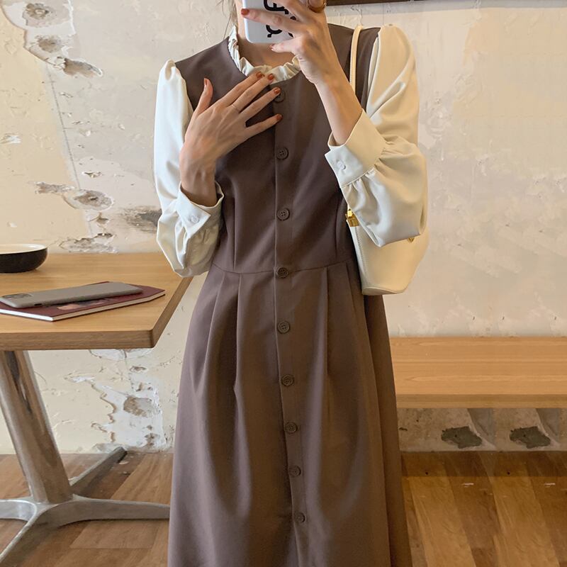 韓国ファッション秋物ラウンドネックスリーブカラーワンピース ロング エレガント オータム Oネック ステッチ 長袖 muzly92712507630