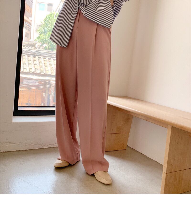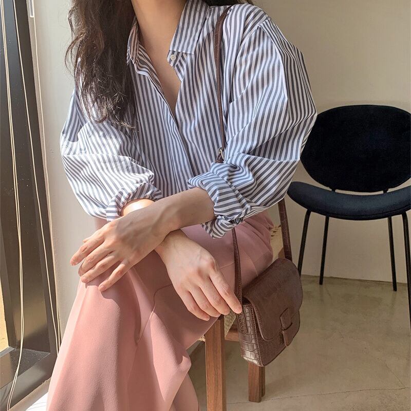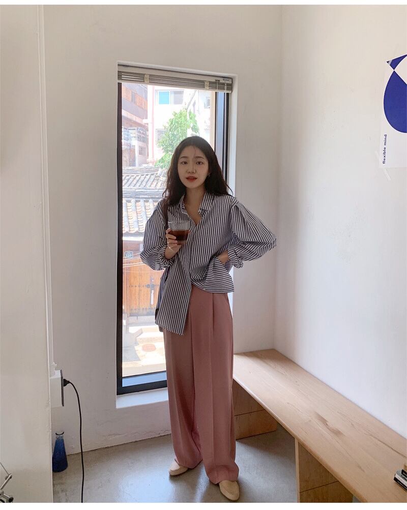韓国ファッションNEWスプリングストライプシャツ ハイウェストルーズパンツ ロング 春物 長袖 ウエスト muzly17525131941