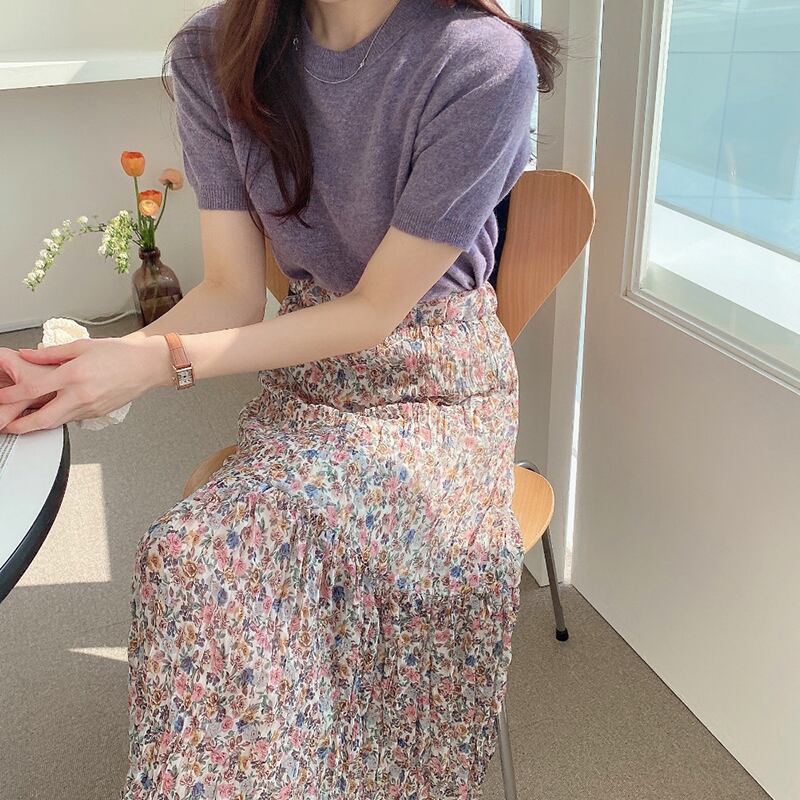 夏服ホワイトラウンドネックニットTシャツハイウェスト薄手ロングフローラルスカート レディース 夏物 花柄 Oネック ウエスト muzly78316042272