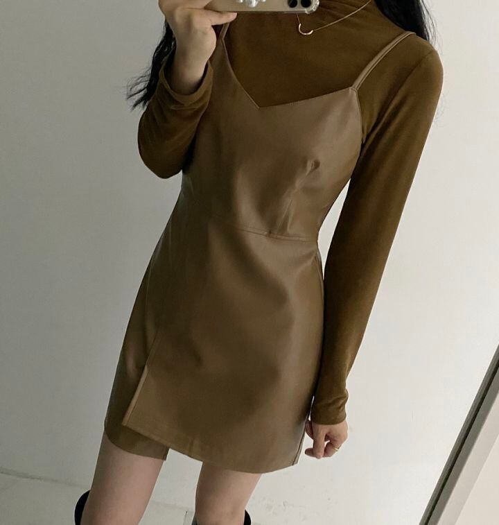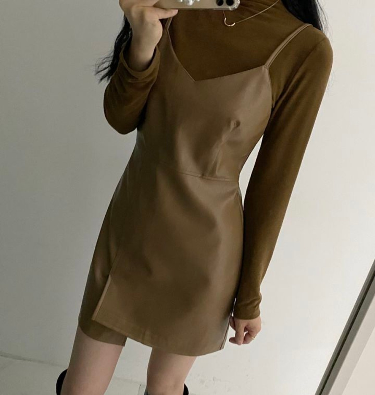 色:ブラウンのボトミングシャツ,黒底シャツ,黒革のスカート,ブラウンレザースカート