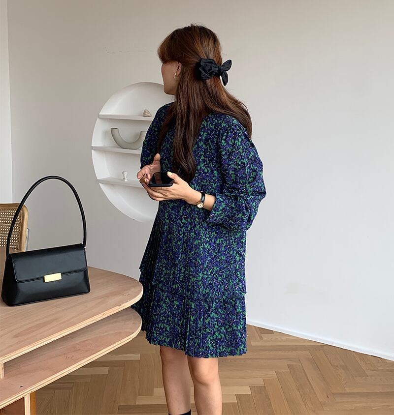 スタンダードスリーブフローラルワンピースダブルプリーツスカート 韓国ファッション長袖 ロング レトロ 花柄 muzly21847347984