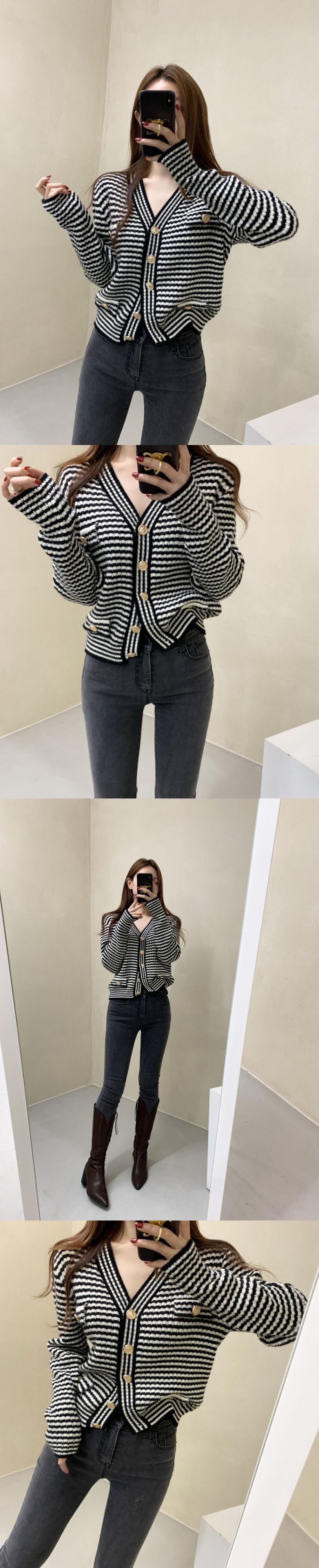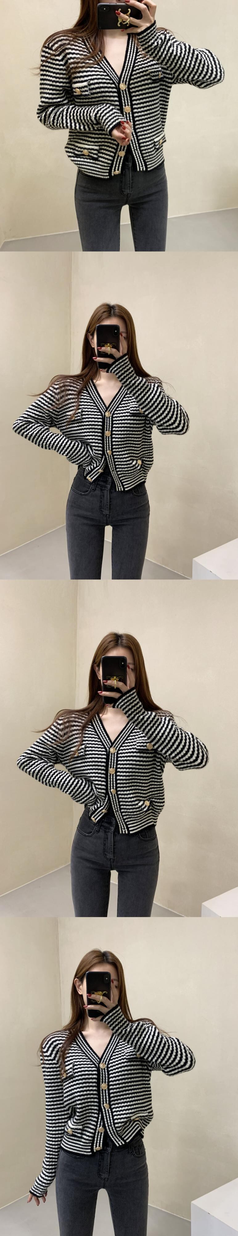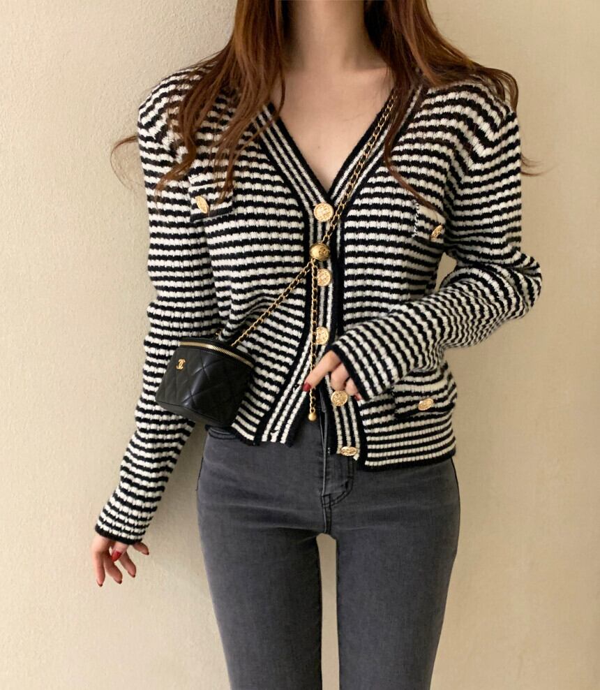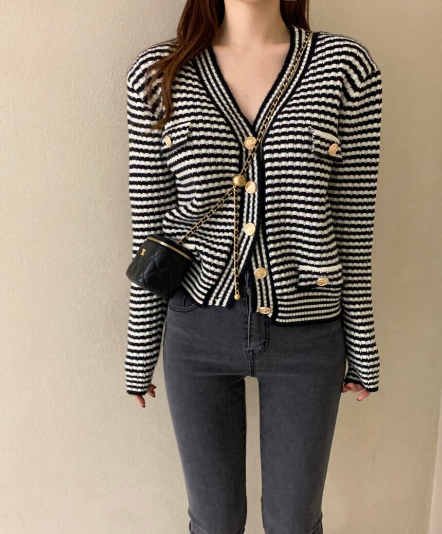 韓国ファッションNEW秋物ウィンタースタンダードVネックストライプニットカーディガンセーター ジャケット レディース ロング レトロ オータム 冬物 長袖 muzly55357547527 | Neatly