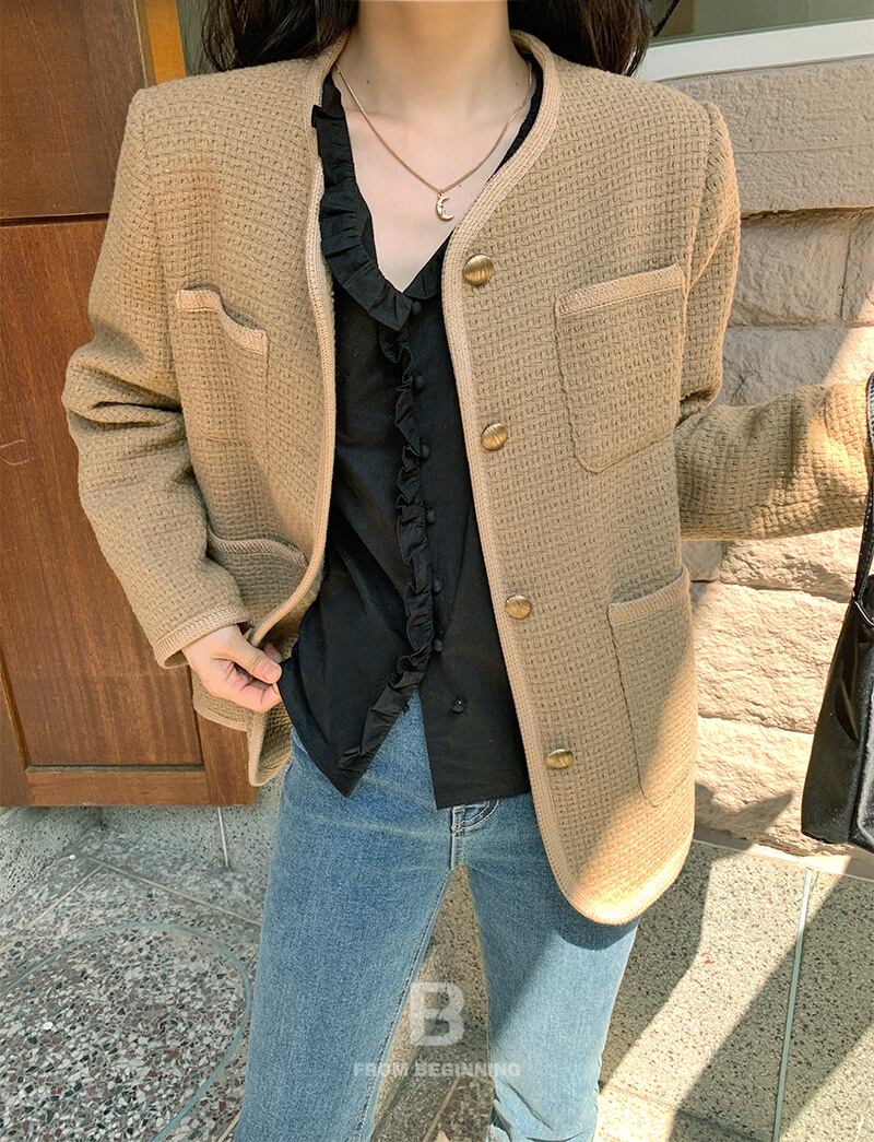 秋物ウィンタースタンダードスタイルラウンドネックルーズツィードジャケット ロング レトロ オータム 冬物 Oネック ポケット多め マルチポケット 長袖 muzly72773947052 | Neatly