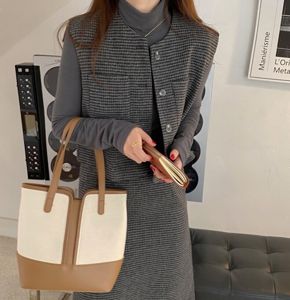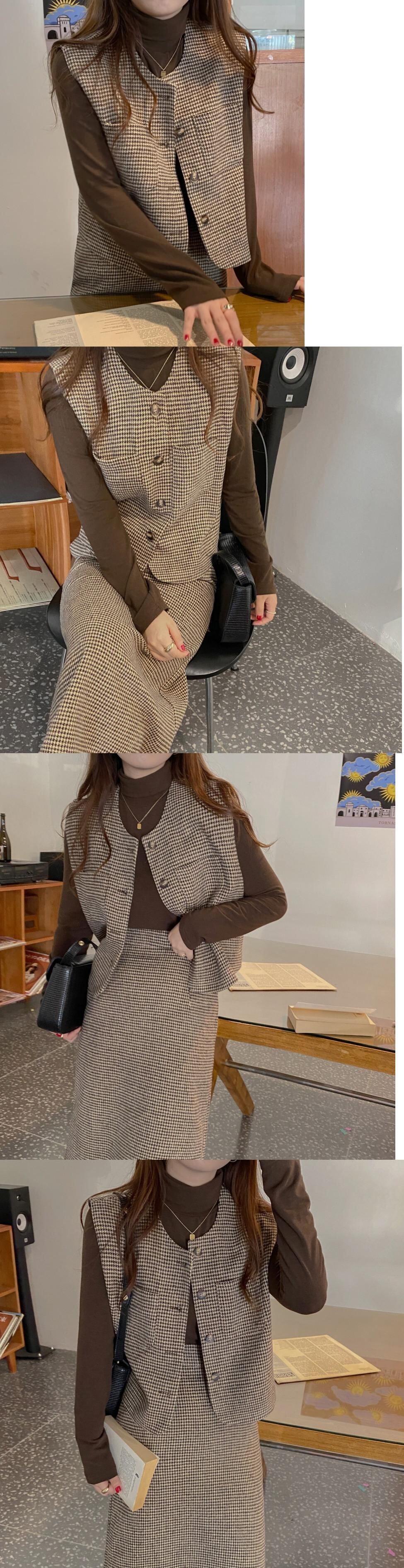 色:スカート付きグレーベスト,スカート付きコーヒーカラーベスト,グレーのボトミングシャツ,コーヒー色のボトミングシャツ