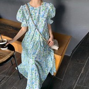 韓国ファッション夏服ラウンドネックスリーブフローラルプリーツロングスカート ルーズミニ ワンピースワンピースレディース 夏物 花柄 Oネック muzly72908657379