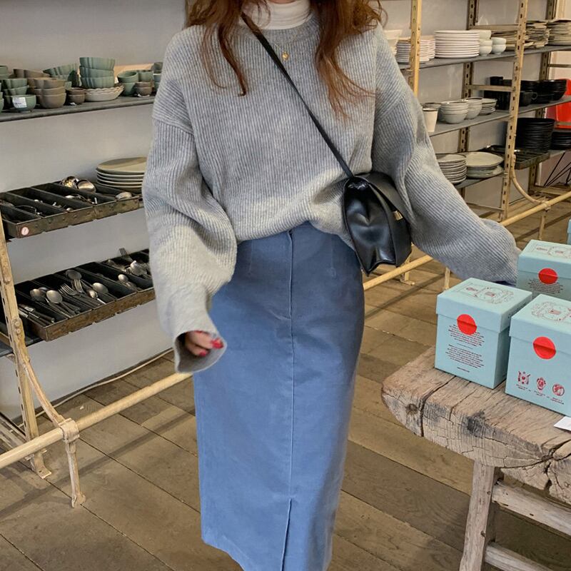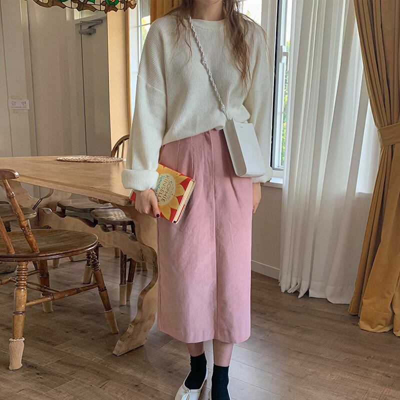 韓国ファッション秋物セーター ハイウェストウェストスリムコーデュロイスカート レディース ロング 大人ガーリー スウィート キュート カジュアル オータム 長袖 ウエスト muzly53909246553 | Neatly