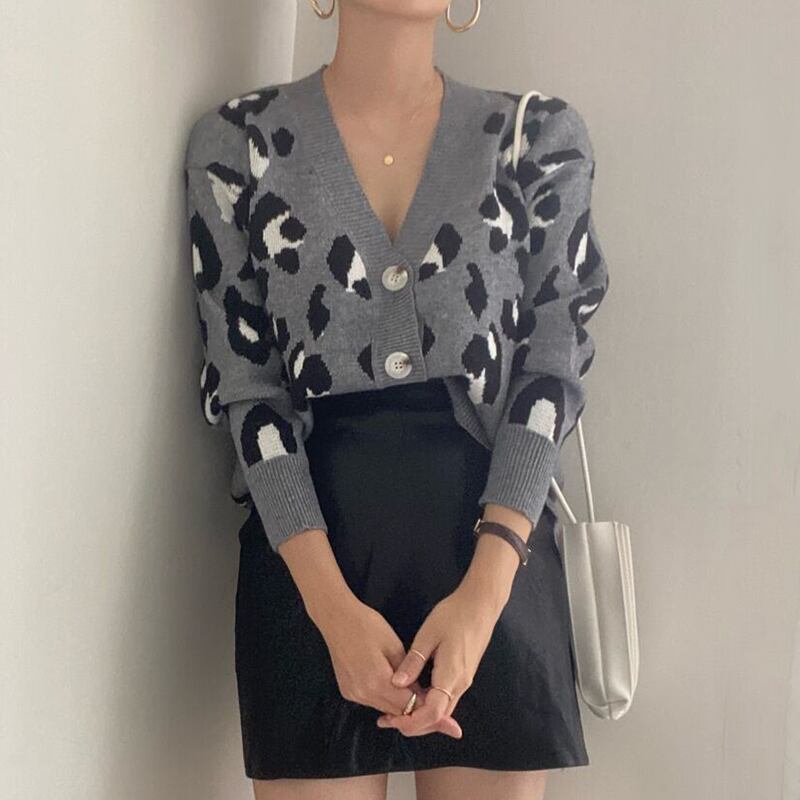 NEW秋物Vネックレオパードプリント柄トップス ルーズニットカーディガンセーター ジャケット ロング オータム 長袖 muzly33095037771