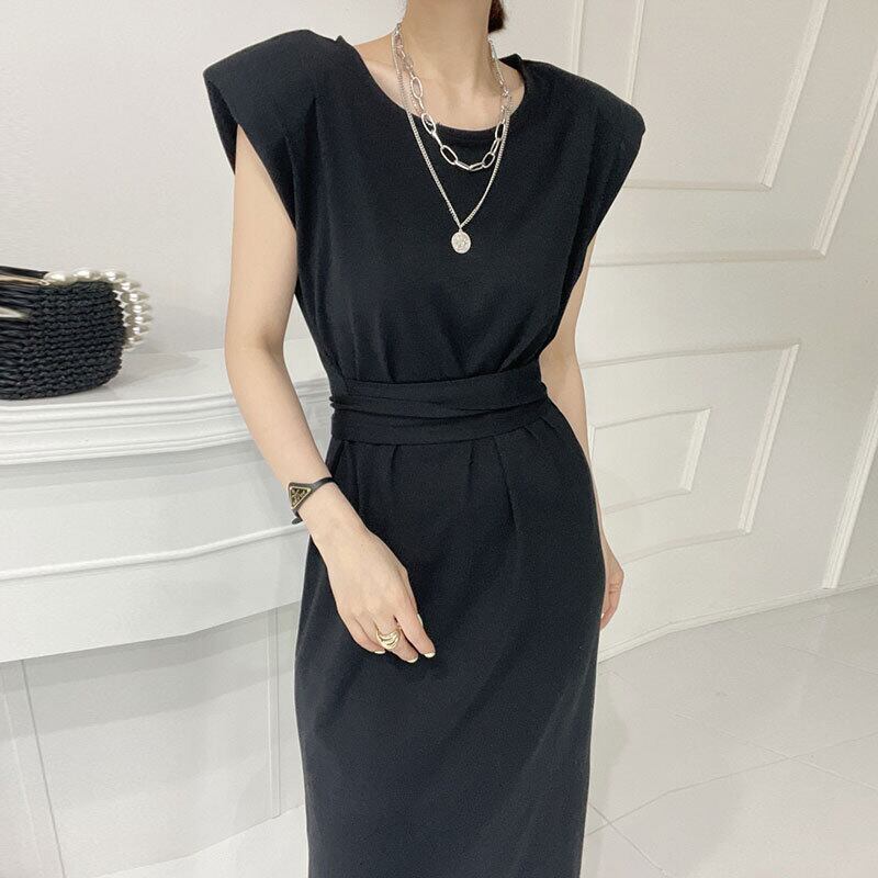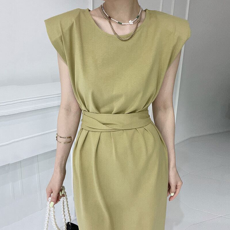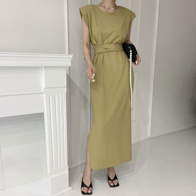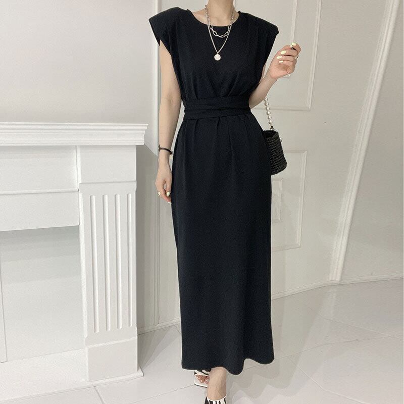 韓国ファッション夏服ソリッド カラーラウンドネックロングスカート ベルト ウェストノースリーブワンピースレディース 夏物 ハーネス Oネック ソリッドカラー ウエスト muzly12444780579 | Neatly