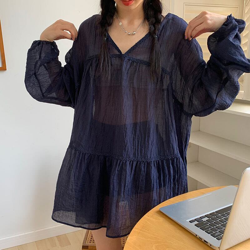 NEW秋物スタンダード薄手Vネックレースシャツ ルーズトップス レディース ロング レトロ オータム 長袖 ミドル丈 muzly48287899042