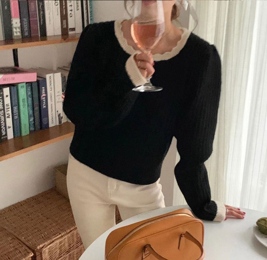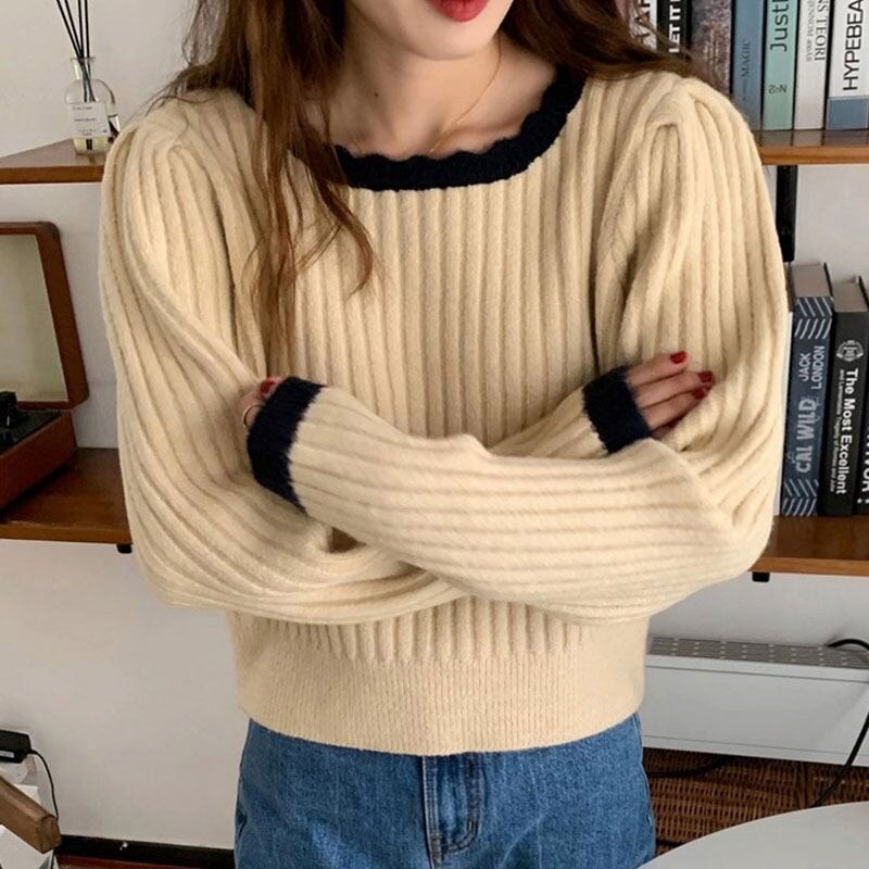 韓国ファッション秋物ウィンターラウンドネックプルオーバー ブラウス ルーズ薄手セーター レディース ロング オータム 冬物 Oネック ステッチ 長袖 muzly53345144073 | Neatly
