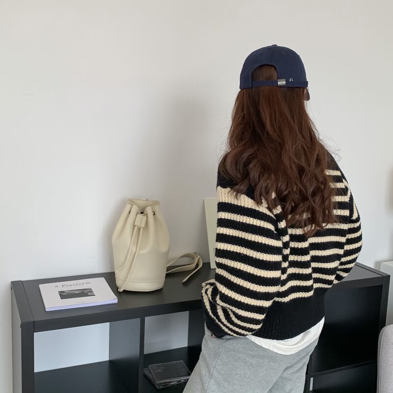 韓国ファッション秋物ウィンタースタンダードラウンドネックプルオーバー ブラウス ルーズ薄手ストライプセーター レディース ロング レトロ オータム 冬物 Oネック ステッチ 長袖 muzly82361355776 | Neatly