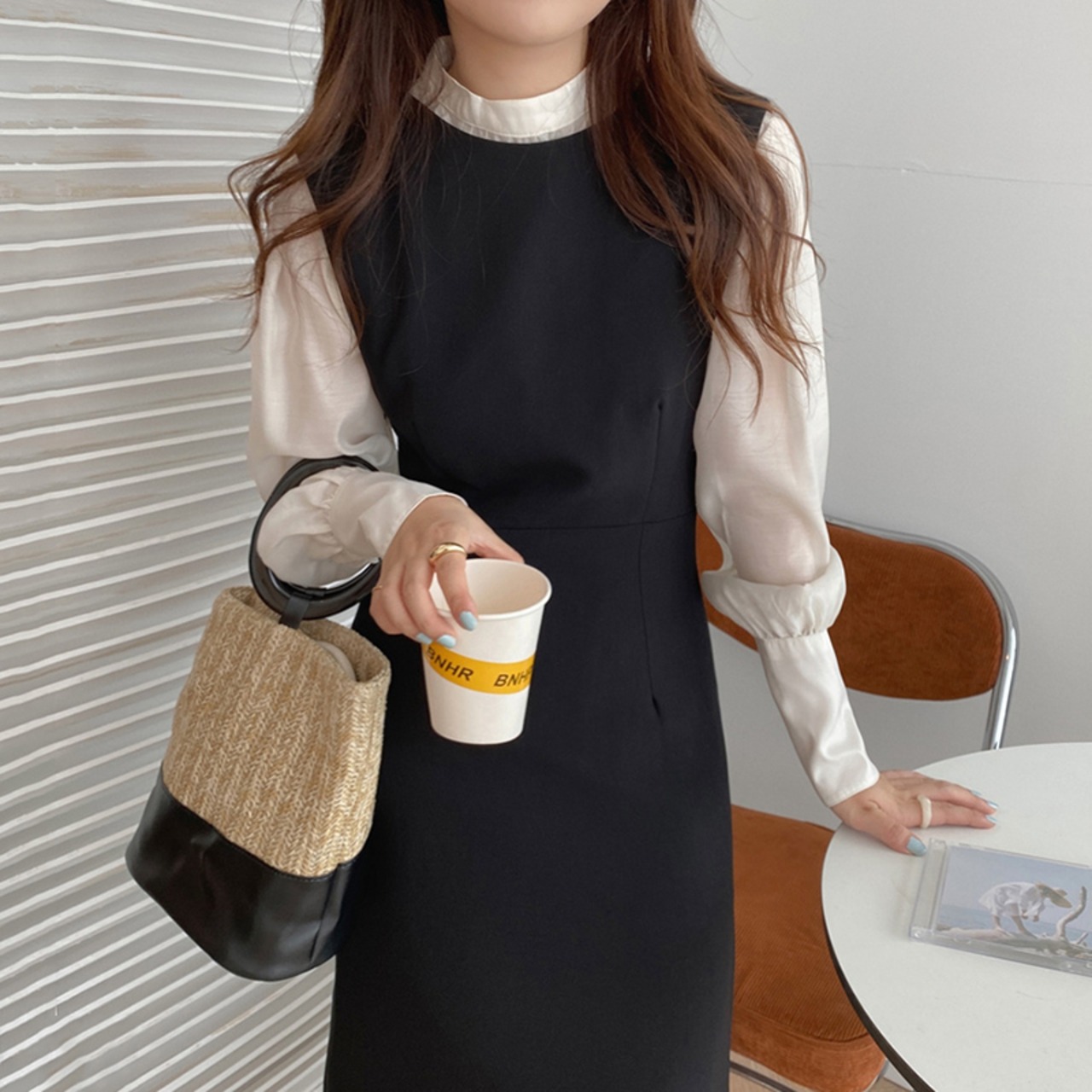 色:ベージュのシャツ,黒いシャツ,黒のタンクスカート,チェック柄ベストドレス
