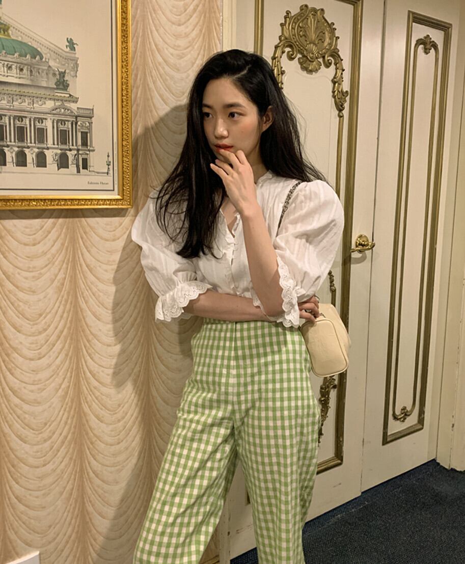 NEW夏服スリーブレースカラー半袖シャツ トップス 格子柄ハイウェストウェストカジュアルパンツ レディース ショート ハーフスリーブ 夏物 ウエスト muzly55783897696 | Neatly