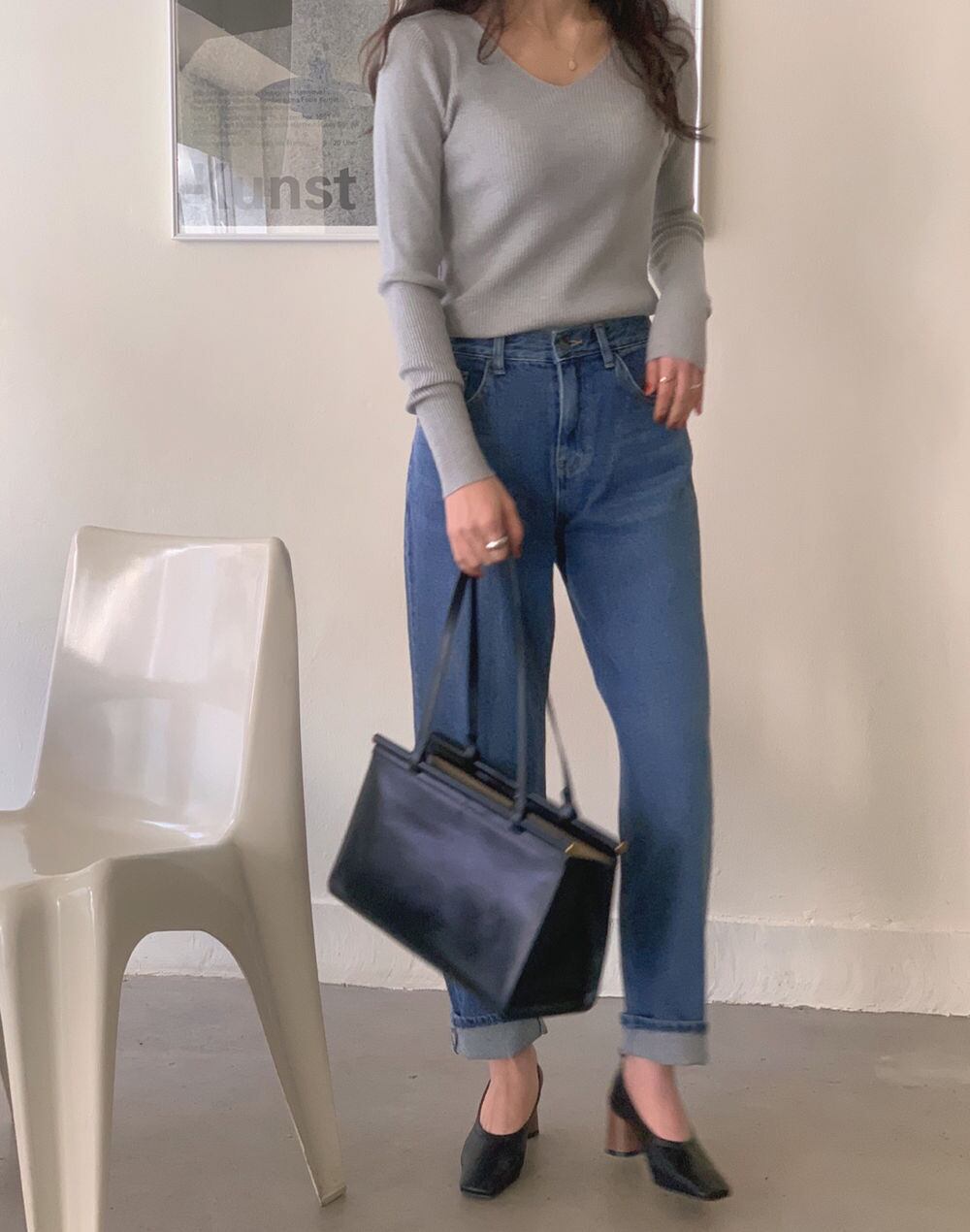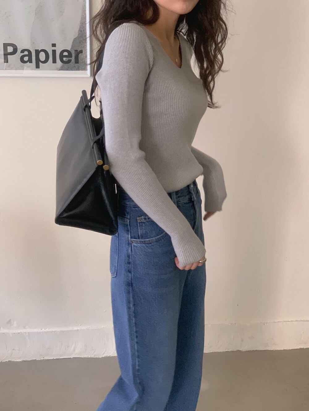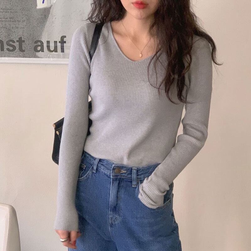 韓国ファッションNEW秋物ベーシックソリッド カラーVネックカジュアルプルオーバー トップス スリムセーター レディース ロング オータム ソリッドカラー 長袖 muzly8647017824 | Neatly