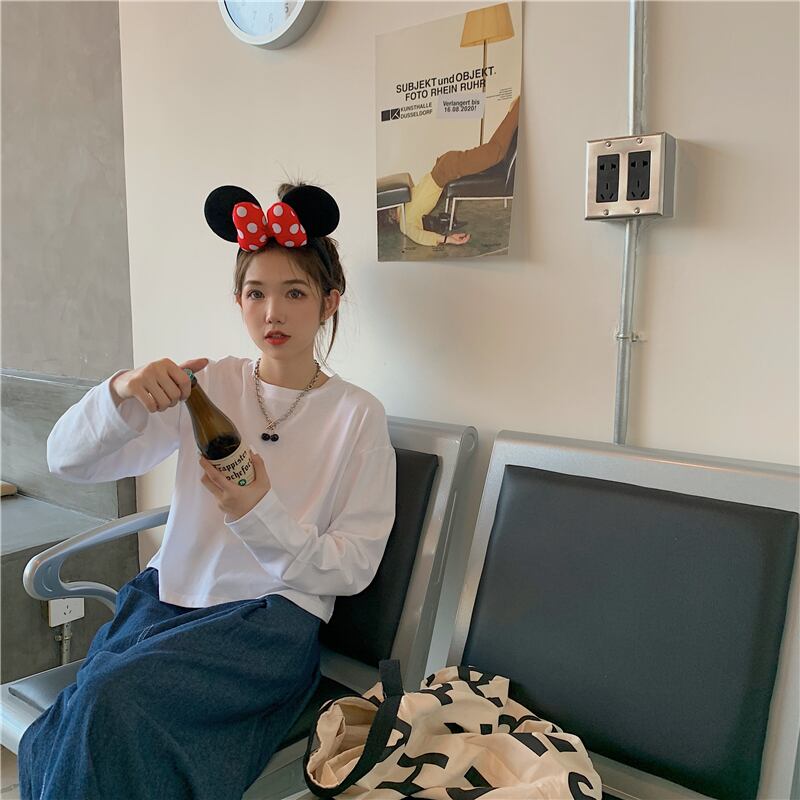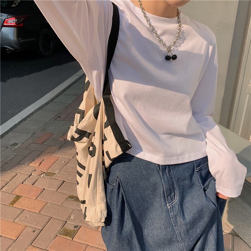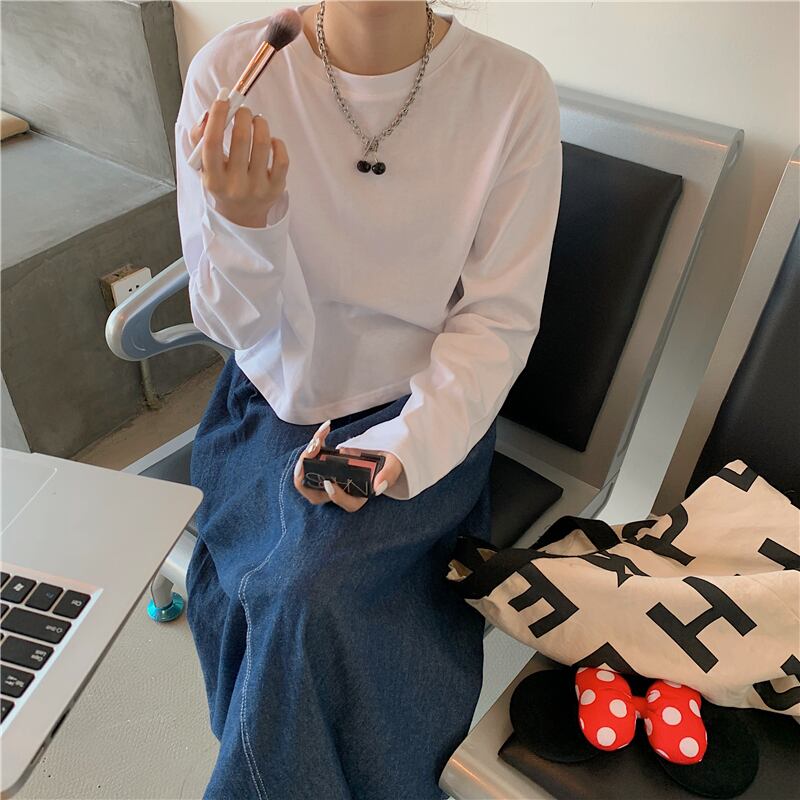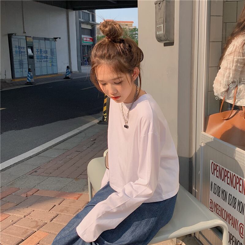 韓国ファッションNEW秋物ベーシックソリッド カラーラウンドネックショートプルオーバー ルーズカジュアルTシャツ ロング オータム Oネック ソリッドカラー 長袖 muzly5636521125 | Neatly