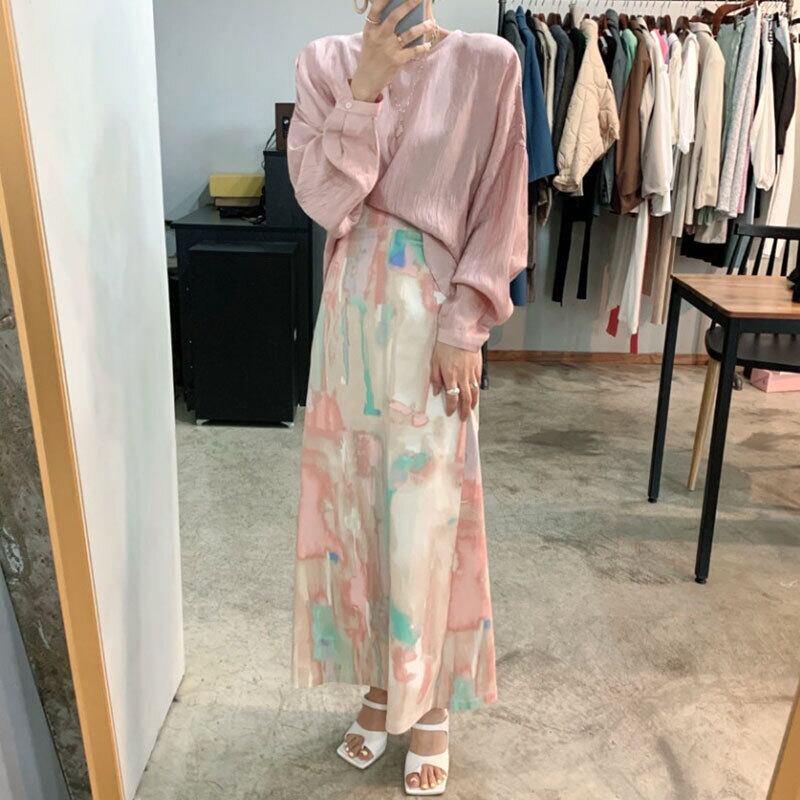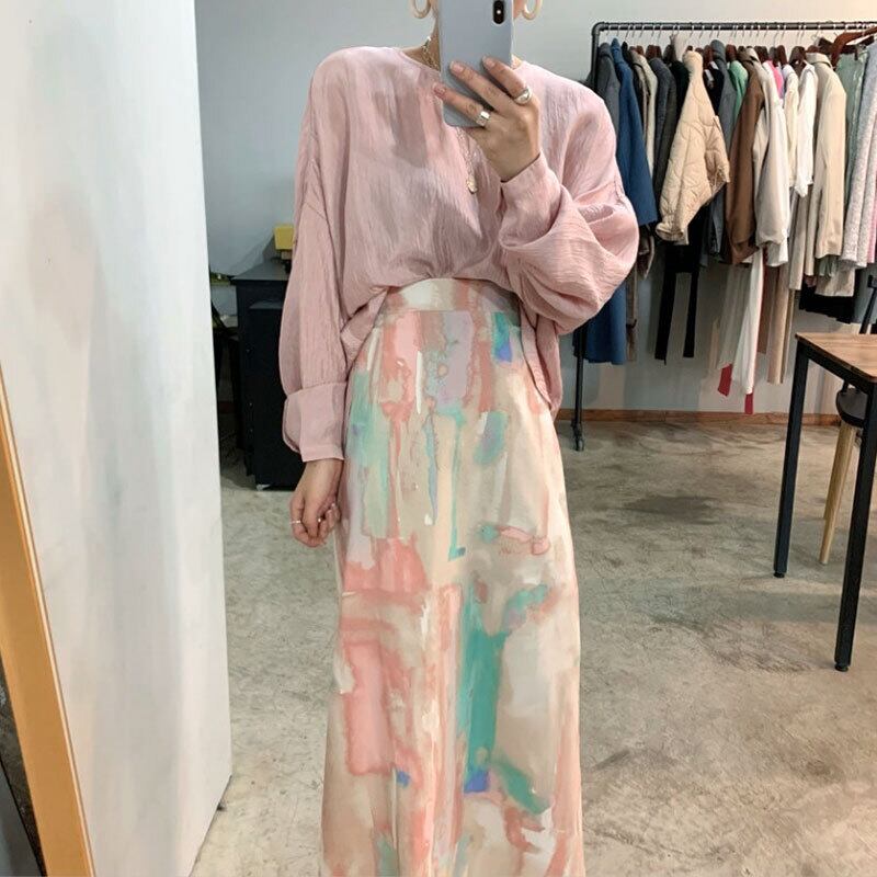 韓国ファッションNEW秋物ラウンドネックルーズ薄手シャツ スタンダードハイウェストカラースカート ロング レトロ 大人ガーリー スウィート キュート カジュアル オータム Oネック 長袖 ウエスト muzly56240594447 | Neatly