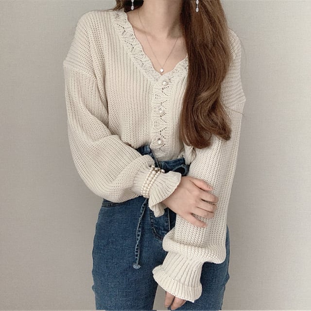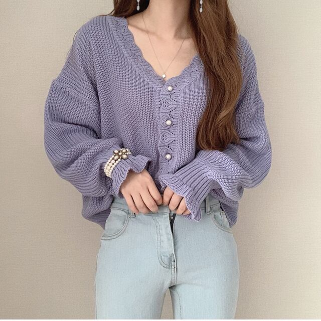 NEW秋物Vネックパールバックルルーズニットカーディガンセーター コート ロング 大人ガーリー スウィート キュート カジュアル オータム 真珠 長袖 muzly10375774319 | Neatly