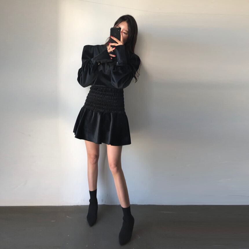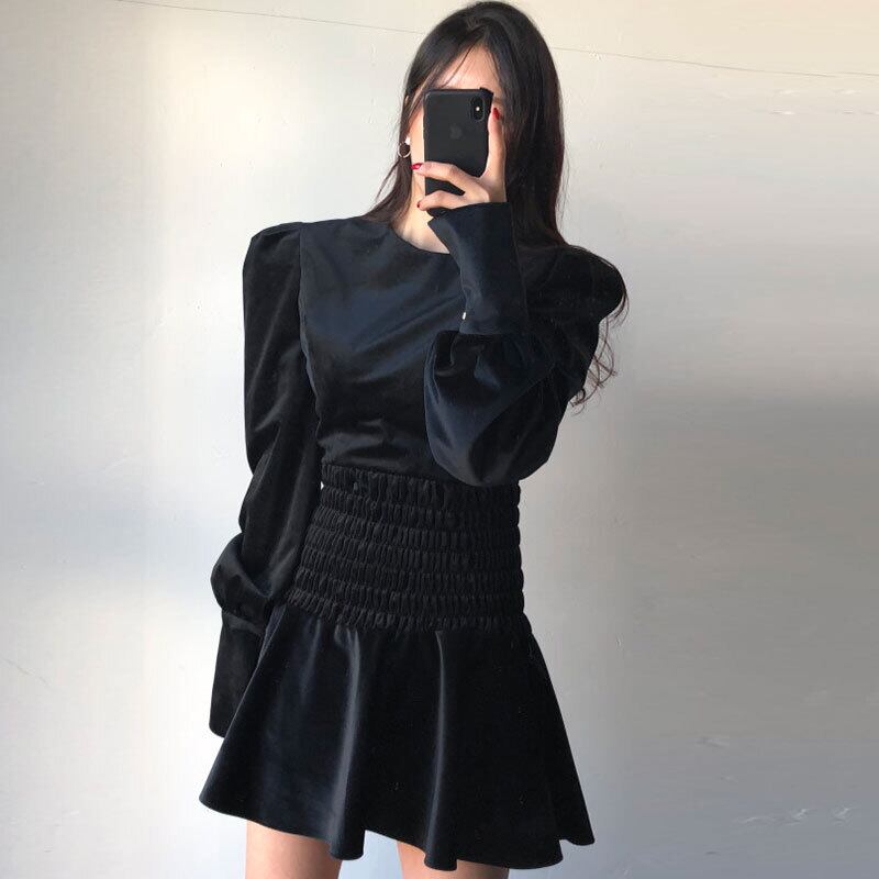 韓国ファッション秋物スタイルダークブラックラウンドネックスリーブ厚みストレッチウェストワンピース ロング エラスティック 伸縮 オータム Oネック 長袖 ウエスト muzly90035982205 | Neatly