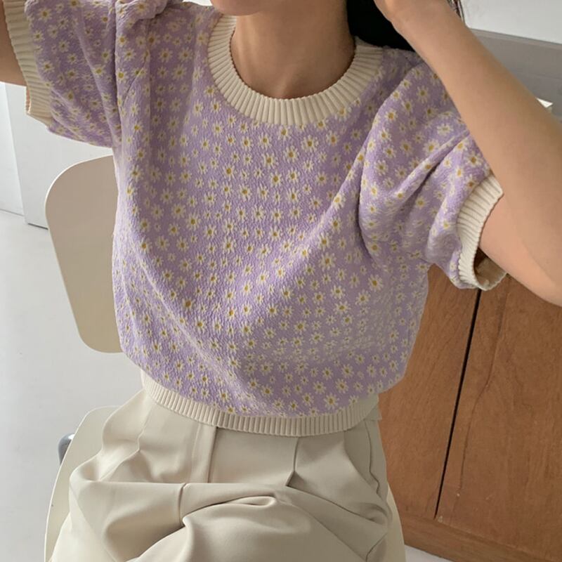 韓国ファッションNEWスプリングカラーラウンドネックTシャツフローラルスリーブセーター プルオーバー 半袖レディース ショート ハーフスリーブ 春物 花柄 Oネック muzly66129110910 | Neatly