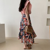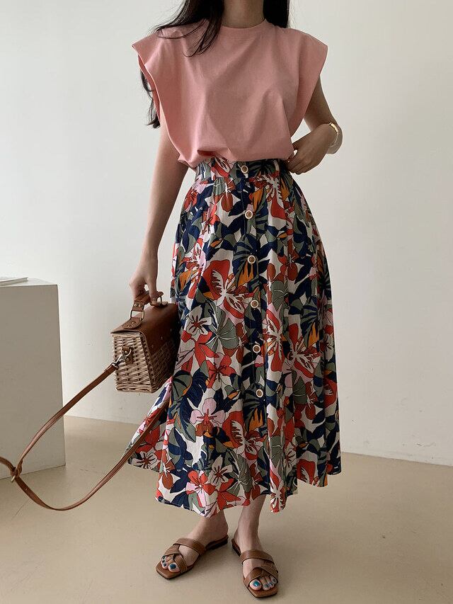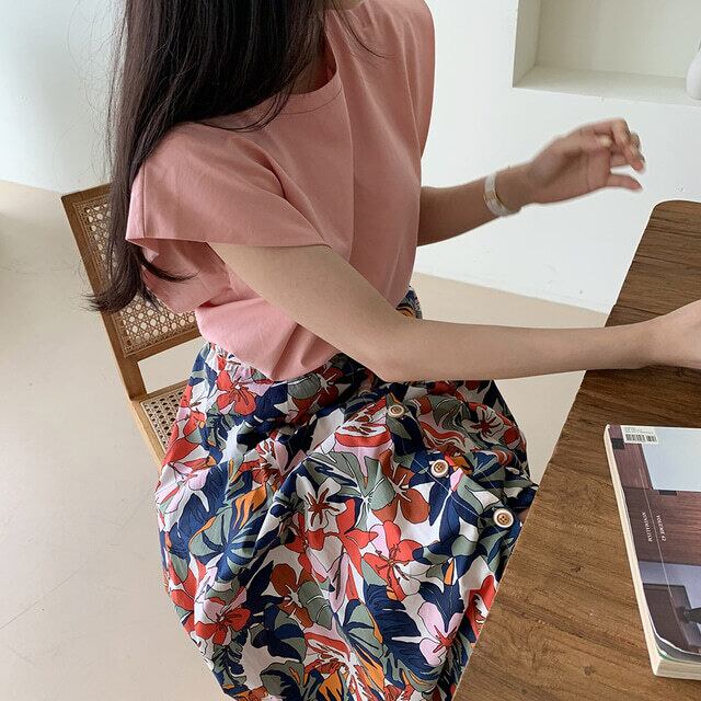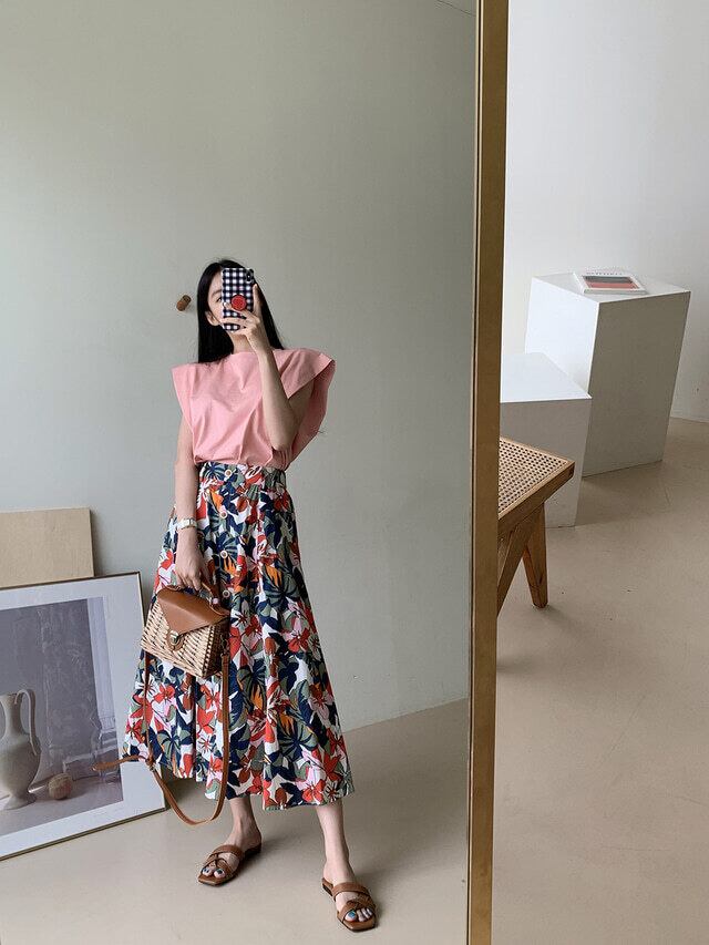 韓国ファッション夏服ソリッド カラースリーブTシャツハイウェスト薄手フローラルスカート 大人ガーリー スウィート キュート カジュアル 夏物 花柄 ソリッドカラー ウエスト muzly11566652378 | Neatly